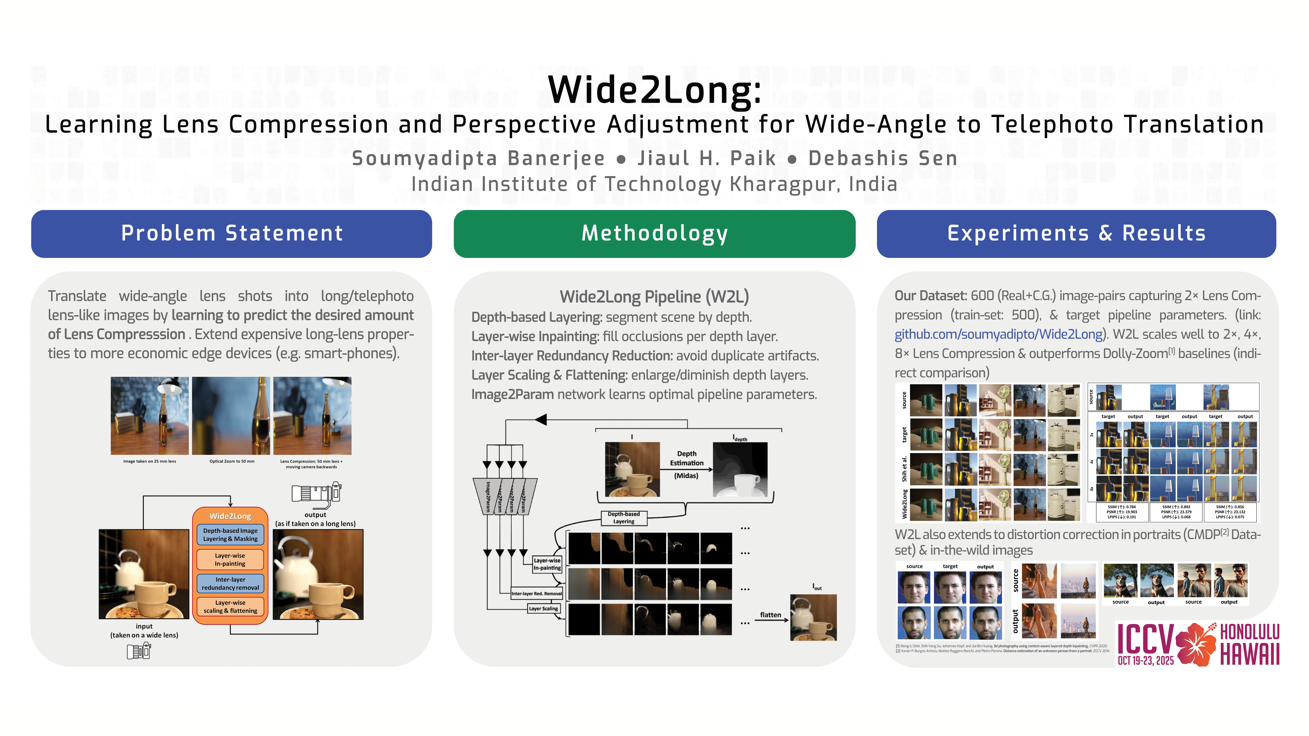 A translation framework that produces images as if they were captured with a telephoto lens, from images captured with a wide-angle lens, will help in reducing the necessity of complex, expensive and bulky lenses on smartphones. To this end, we propose an image-to-image translation pipeline to simulate the lens compression and perspective adjustment associated with this reconstruction, where the size of the main subject in the images remains the same. We judiciously design depth-based image layering, layer-wise in-painting, redundancy reduction and layer scaling modules to construct the desired tele-photo image, where the pipeline parameters are estimated by a convolutional network. Our approach is compatible with the related optical transformation, and hence, contents behind the main subject are enlarged and that before are diminished, achieving lens compression with appropriate perspective adjustment. Our pipeline performs well qualitatively and quantitatively on several source-target image pairs we have captured solely for this task, and also on images in-the-wild. We show that it can simulate the different amounts of lens compression associated with targeted $2\times$, $4\times$, $8\times$ changes in the focal length. Further, the pipeline is demonstrated to be effective for a sub-class of the lens-compression problem - portrait perspective distortion correction. We also provide an ablation study to show the significance of the various components in the pipeline.