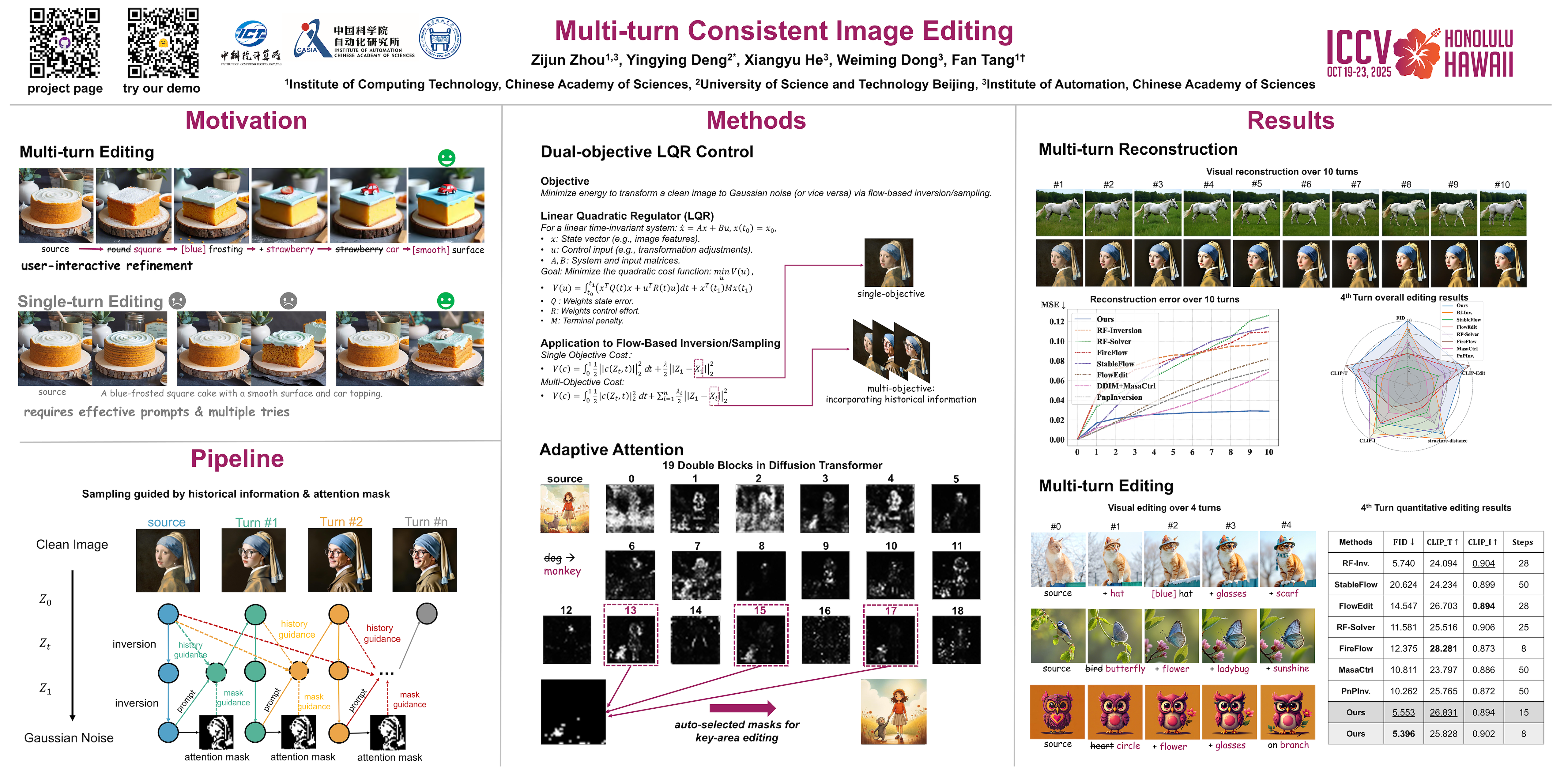 Many real-world applications, such as interactive photo retouching, artistic content creation, and product design, require flexible and iterative image editing. However, existing image editing methods primarily focus on achieving the desired modifications in a single step, which often struggles with ambiguous user intent, complex transformations, or the need for progressive refinements. As a result, these methods frequently produce inconsistent outcomes or fail to meet user expectations. To address these challenges, we propose a multi-turn image editing framework that enables users to iteratively refine their edits, progressively achieving more satisfactory results. Our approach leverages flow matching for accurate image inversion and a dual-objective Linear Quadratic Regulators (LQR) for stable sampling, effectively mitigating error accumulation. Additionally, by analyzing the layer-wise roles of transformers, we introduce a adaptive attention highlighting method that enhances editability while preserving multi-turn coherence. Extensive experiments demonstrate that our framework significantly improves edit success rates and visual fidelity compared to existing methods.