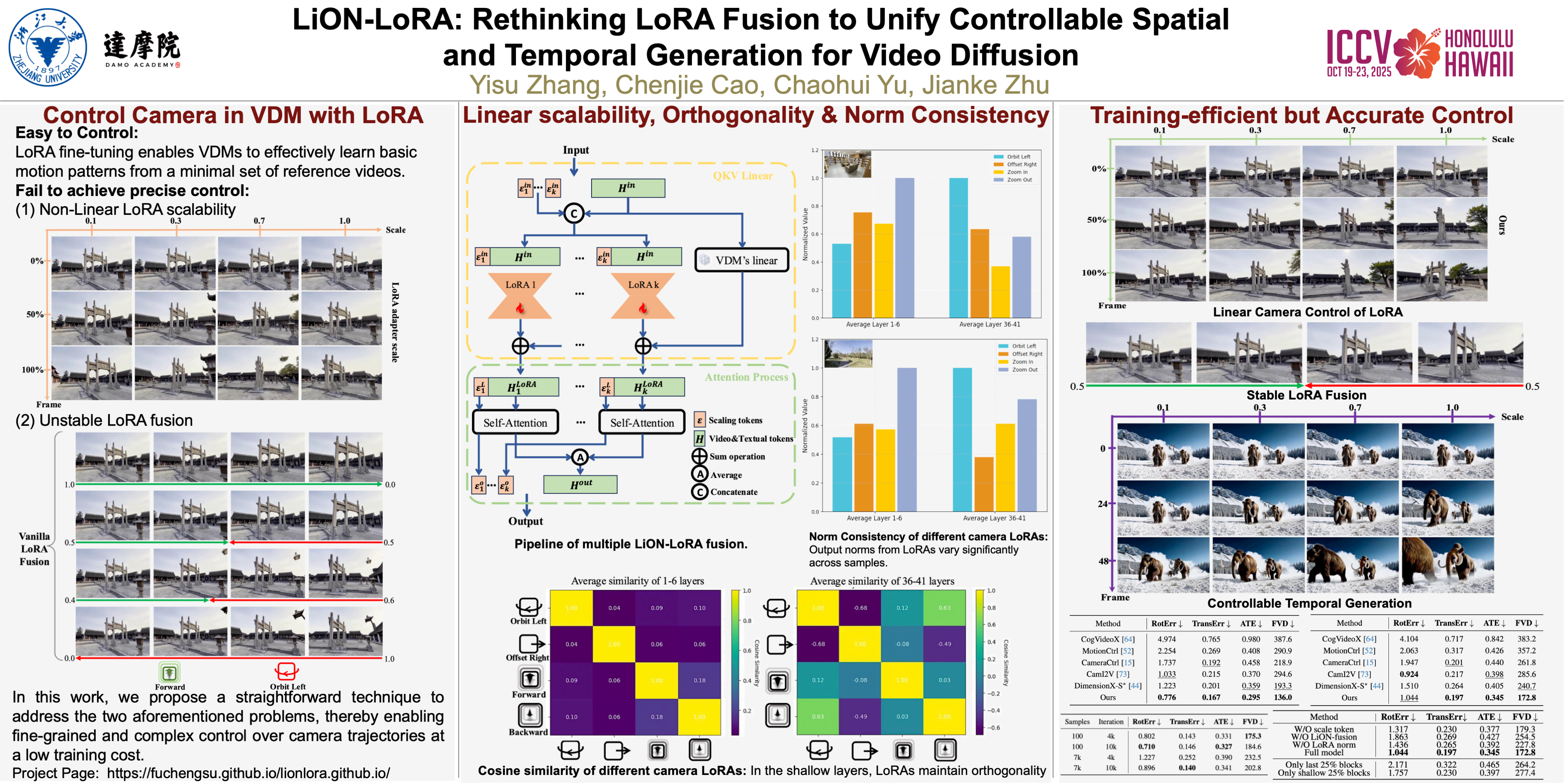 Video Diffusion Models (VDMs) have demonstrated remarkable capabilities in synthesizing realistic videos by learning from large-scale data. Although vanilla Low-Rank Adaptation (LoRA) can learn specific spatial or temporal movement to driven VDMs with constrained data, achieving precise control over both camera trajectories and object motion remains challenging due to the unstable fusion and non-linear scalability. To address these issues, we propose LiON-LoRA, a novel framework that rethinks LoRA fusion through three core principles: Linear scalability, Orthogonality, and Norm consistency. First, we analyze the orthogonality of LoRA features in shallow VDM layers, enabling decoupled low-level controllability. Second, norm consistency is enforced across layers to stabilize fusion during complex camera motion combinations. Third, a controllable token is integrated into the diffusion transformer (DiT) to linearly adjust motion amplitudes for both cameras and objects with a modified self-attention mechanism to ensure decoupled control. Additionally, we extend LiON-LoRA to temporal generation by leveraging static-camera videos, unifying spatial and temporal controllability. Experiments demonstrate that LiON-LoRA outperforms state-of-the-art methods in trajectory control accuracy and motion strength adjustment, achieving superior generalization with minimal training data.