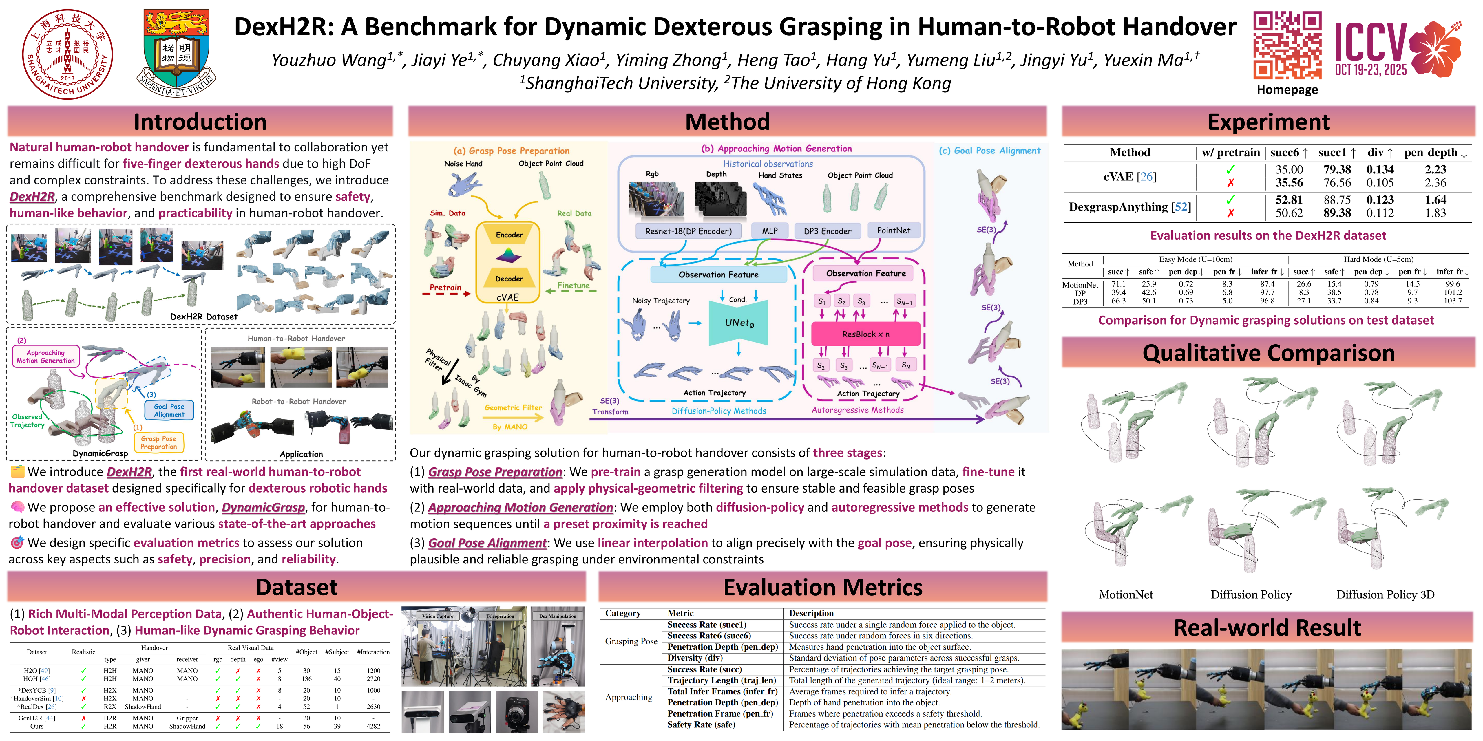 Handover between a human and a dexterous robotic hand is a fundamental yet challenging task in human-robot collaboration. It requires handling dynamic environments and a wide variety of objects, and demands robust and adaptive grasping strategies. However, progress in developing effective dynamic dexterous grasping methods is limited by the absence of high-quality, real-world human-to-robot handover datasets. Existing datasets primarily focus on grasping static objects or rely on synthesized handover motions, which differ significantly from real-world robot motion patterns, creating a substantial gap in applicability.In this paper, we introduce DexH2R, a comprehensive real-world dataset for human-to-robot handovers, built on dexterous robotic hand. Our dataset captures a diverse range of interactive objects, dynamic motion patterns, rich visual sensor data, and detailed annotations. Additionally, to ensure natural and human-like dexterous motions, we utilize teleoperation for data collection, enabling the robot’s movements to align with human behaviors and habits, which is a crucial characteristic for intelligent humanoid robots.Furthermore, we propose an effective solution, DynamicGrasp, for human-to-robot handover and evaluate various state-of-the-art approaches, including auto-regressive models and diffusion policy methods, providing a thorough comparison and analysis. We believe our benchmark will drive advancements in human-to-robot handover research by offering a high-quality dataset, effective solutions, and comprehensive evaluation metrics.