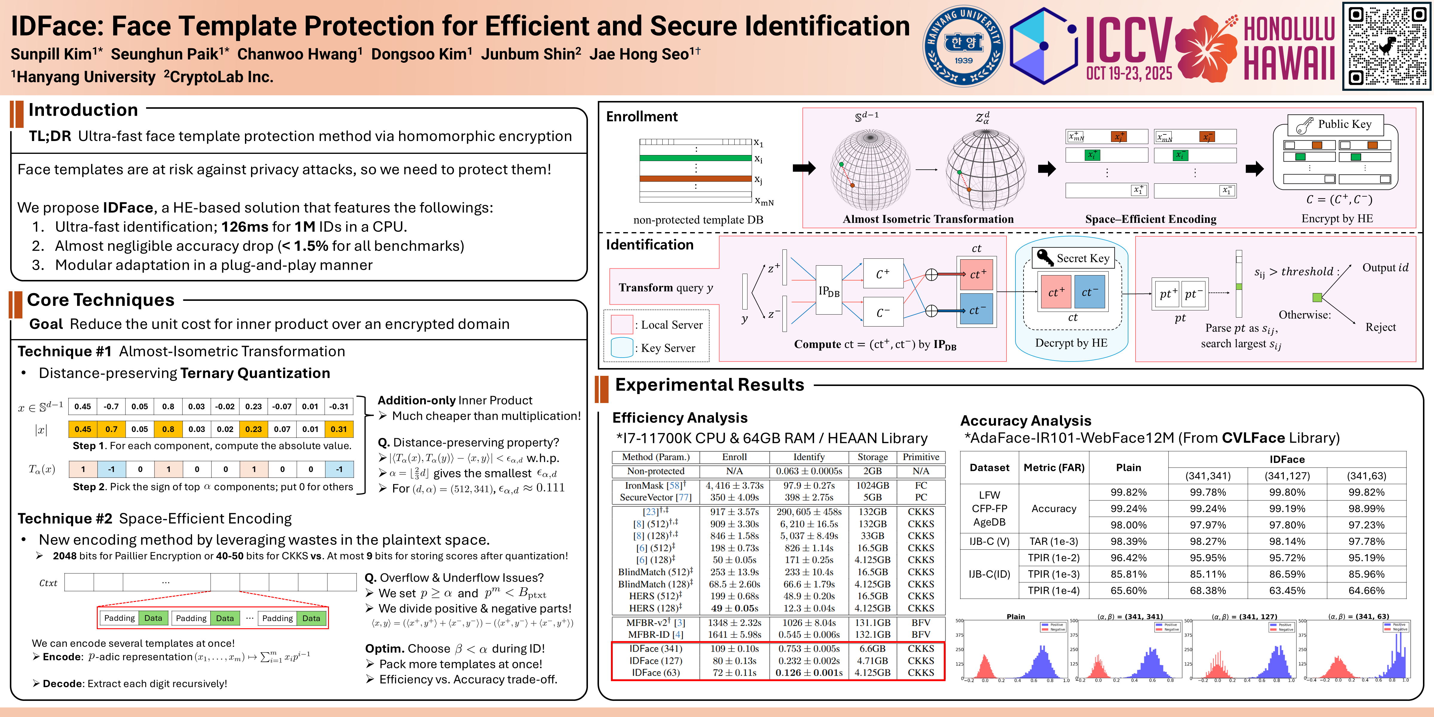 As face recognition systems (FRS) become more widely used, user privacy becomes more important. A key privacy issue in FRS is to protect the user’s face template, since the characteristics of the user’s face image can be recovered from the template. Although recent advances in cryptographic tools such as homomorphic encryption (HE) have provided opportunities for securing the FRS, HE cannot be used directly with FRS in an efficient plug-and-play manner. In particular, although HE is functionally complete for arbitrary programs, it is basically designed for algebraic operations on encrypted data of predetermined shape such as a polynomial ring. Thus, a non-tailored combination of HE and the system can yield very inefficient performance, and many previous HE-based face template protection methods are hundreds of times slower than plain systems without protection. In this study, we propose $\mathsf{IDFace}$, a new HE-based secure and efficient face identification method with template protection. The $\mathsf{IDFace}$ is designed on the basis of two novel techniques for efficient searching on a (homomorphically encrypted) biometric database with an angular metric. The first technique is a template representation transformation that sharply reduces the unit cost for the matching test. The second is a space-efficient encoding that reduces wasted space from the encryption algorithm, thus saving the number of operations on encrypted templates. Through experiments, we show that $\mathsf{IDFace}$ can identify a face template from among a database of 1M encrypted templates in less than a second, which is at most \textcolor{red}{\textrm{97.6X}} faster than the previous best result using HE.