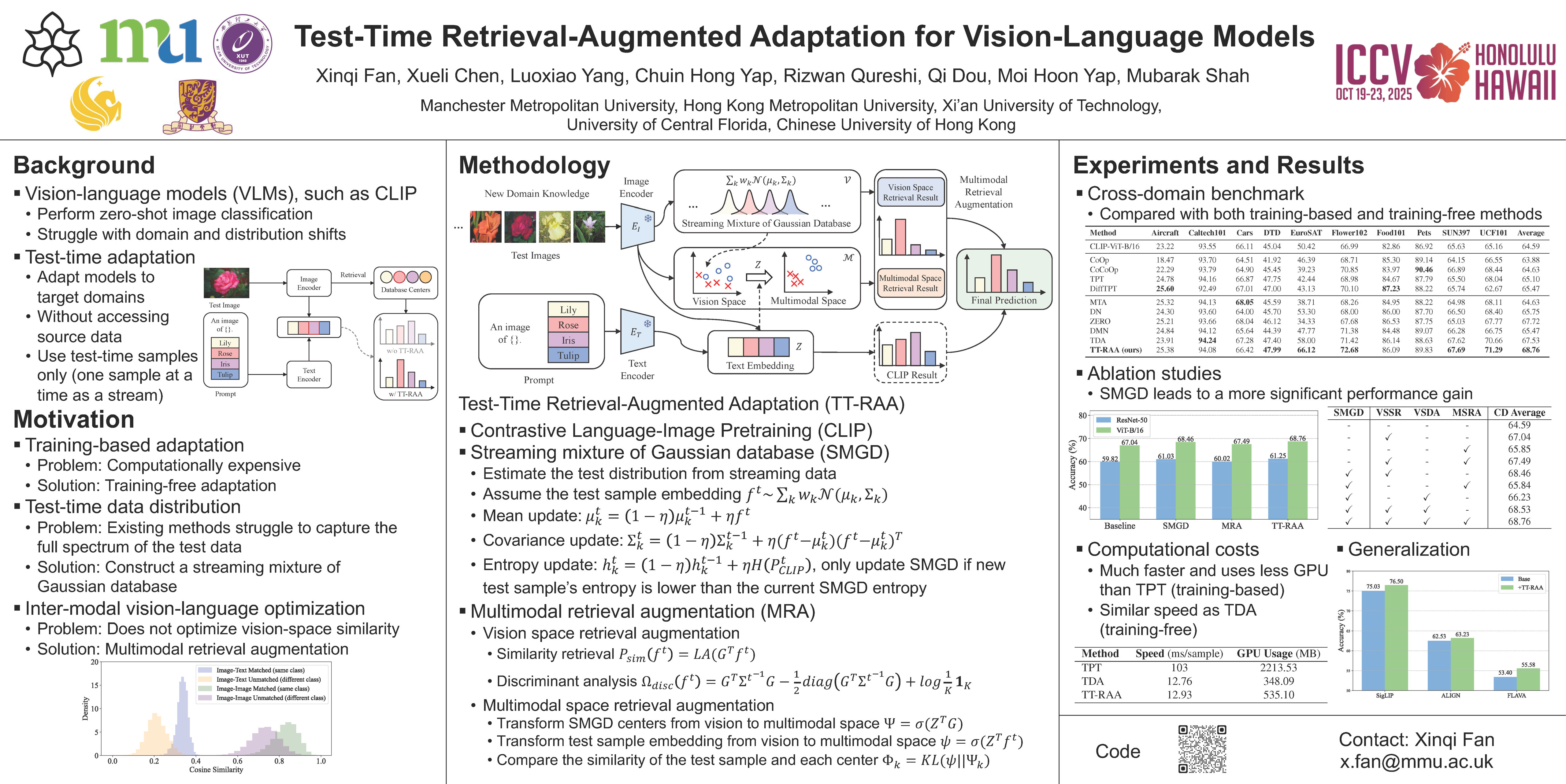 Vision-language models (VLMs) have shown promise in test-time adaptation tasks due to their remarkable capabilities in understanding and reasoning about visual content through natural language descriptions. However, training VLMs typically demands substantial computational resources, and they often struggle to adapt efficiently to new domains or tasks. Additionally, dynamically estimating the test distribution from streaming data at test time remains a significant challenge. In this work, we propose a novel test-time retrieval-augmented adaption (TT-RAA) method that enables VLMs to maintain high performance across diverse visual recognition tasks without the need for task-specific training or large computational overhead. During inference, TT-RAA employs a streaming mixture of Gaussian database (SMGD) to continuously estimate test distributions, requiring minimal storage. Then, TT-RAA retrieves the most relevant information from the SMGD, enhancing the original VLM outputs. A key limitation of CLIP-based VLMs is their inter-modal vision-language optimization, which does not optimize vision-space similarity, leading to larger intra-modal variance. To address this, we propose a multimodal retrieval augmentation module that transforms the SMGD into a unified multimodal space, enabling retrieval that aligns both vision and language modalities. Extensive experiments across both cross-domain and out-of-distribution benchmarks comprising fourteen datasets demonstrate TT-RAA’s superior performance compared to state-of-the-art methods. Ablation studies and hyperparameter analyses further validate the effectiveness of the proposed modules.