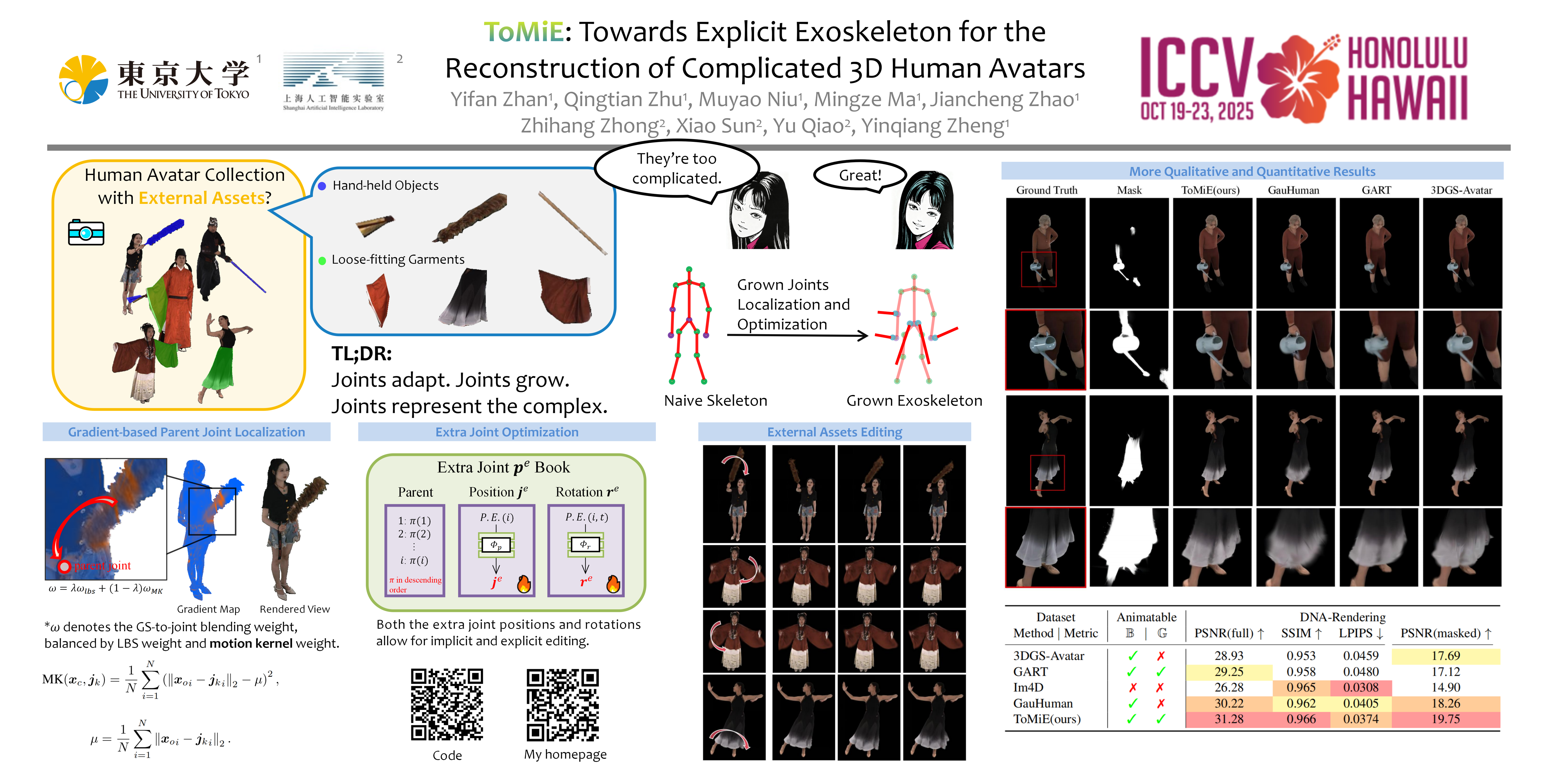 In this paper, we highlight a critical yet often overlooked factor in most 3D human tasks, namely modeling complicated 3D human with with hand-held objects or loose-fitting clothing. It is known that the parameterized formulation of SMPL is able to fit human skin; while hand-held objects and loose-fitting clothing, are difficult to get modeled within the unified framework, since their movements are usually decoupled with the human body.To enhance the capability of SMPL skeleton in response to this situation, we propose a growth strategy that enables the joint tree of the skeleton to expand adaptively. Specifically, our method, called ToMiE, consists of parent joints localization and external joints optimization. For parent joints localization, we employ a gradient-based approach guided by both LBS blending weights and motion kernels.Once the external joints are obtained, we proceed to optimize their transformations in SE(3) across different frames, enabling rendering and explicit animation.ToMiE manages to outperform other methods across various cases with hand-held objects and loose-fitting clothing, not only in rendering quality but also by offering free animation of grown joints, thereby enhancing the expressive ability of SMPL skeleton for a broader range of applications.