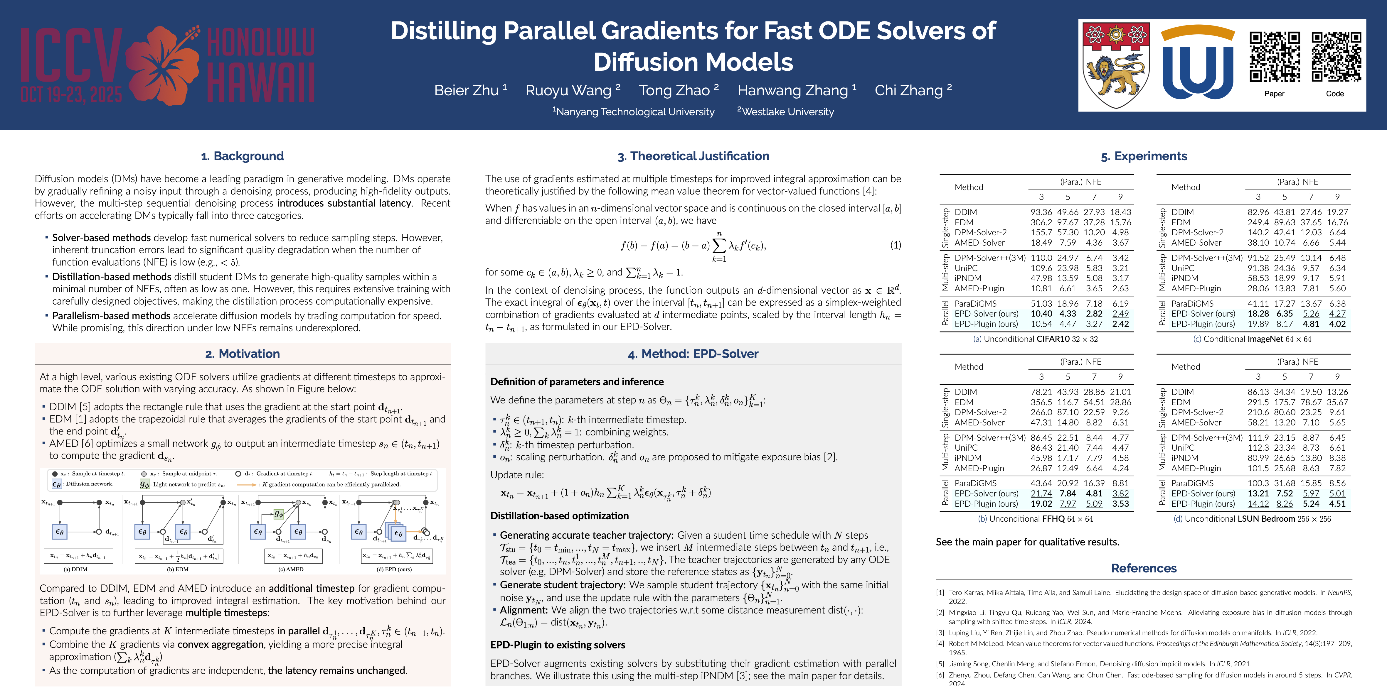 Diffusion models (DMs) have achieved state-of-the-art generative performance but suffer from high sampling latency due to their sequential denoising nature. Existing solver-based acceleration methods often face image quality degradation under a low-latency budget. In this paper, we propose the Ensemble Parallel Direction solver (dubbed as EPD-Solver), a novel ODE solver that mitigates truncation errors by incorporating multiple parallel gradient evaluations in each ODE step. Importantly, since the additional gradient computations are independent, they can be fully parallelized, preserving low-latency sampling. Our method optimizes a small set of learnable parameters in a distillation fashion, ensuring minimal training overhead. Extensive experiments on various image synthesis benchmarks demonstrate the effectiveness of our EPD-Solver in achieving high-quality and low-latency sampling. For example, at the same latency level of 5 NFE, EPD achieves an FID of 5.26 on CIFAR-10, 8.74 on FFHQ, 7.95 on ImageNet, and 7.79 on LSUN Bedroom, surpassing existing learning-based solvers by a significant margin.