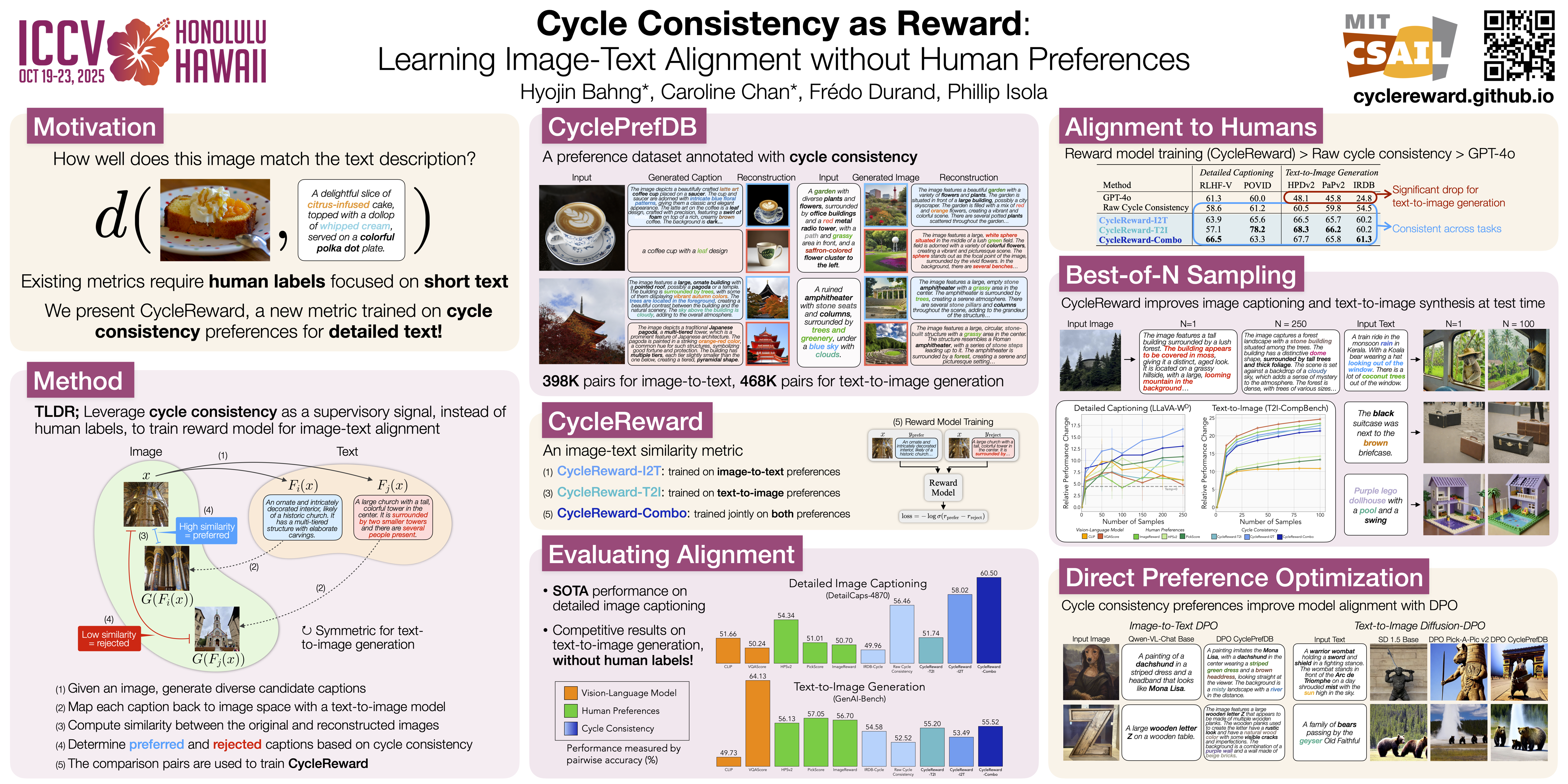 Current metrics for image-text alignment rely on human preferences or task-oriented VQA datasets for supervision. We propose an alternative approach that leverages cycle consistency as a supervisory signal. Given an image, we generate diverse captions using image-to-text models, then map these captions back to image space with a text-to-image model. We compute a cycle consistency score by measuring perceptual similarity between the original and reconstructed image. The score is used to determine preferences over captions, i.e., more descriptive and accurate captions yield faithful reconstructions and are thus preferred over lower quality captions. Analogously, we can measure cycle consistency in the text-to-image-to-text direction by measuring textual similarity between an input caption and its reconstruction through the cycle. We explore both mapping directions, resulting in 398K image-to-text pairs and 468K text-to-image comparison pairs. Our reward model, trained on this dataset, outperforms state-of-the-art methods on detailed captioning tasks, with superior inference-time scalability when used as a verifier for Best-of-N evaluation. We will release our dataset, model, and code upon acceptance.