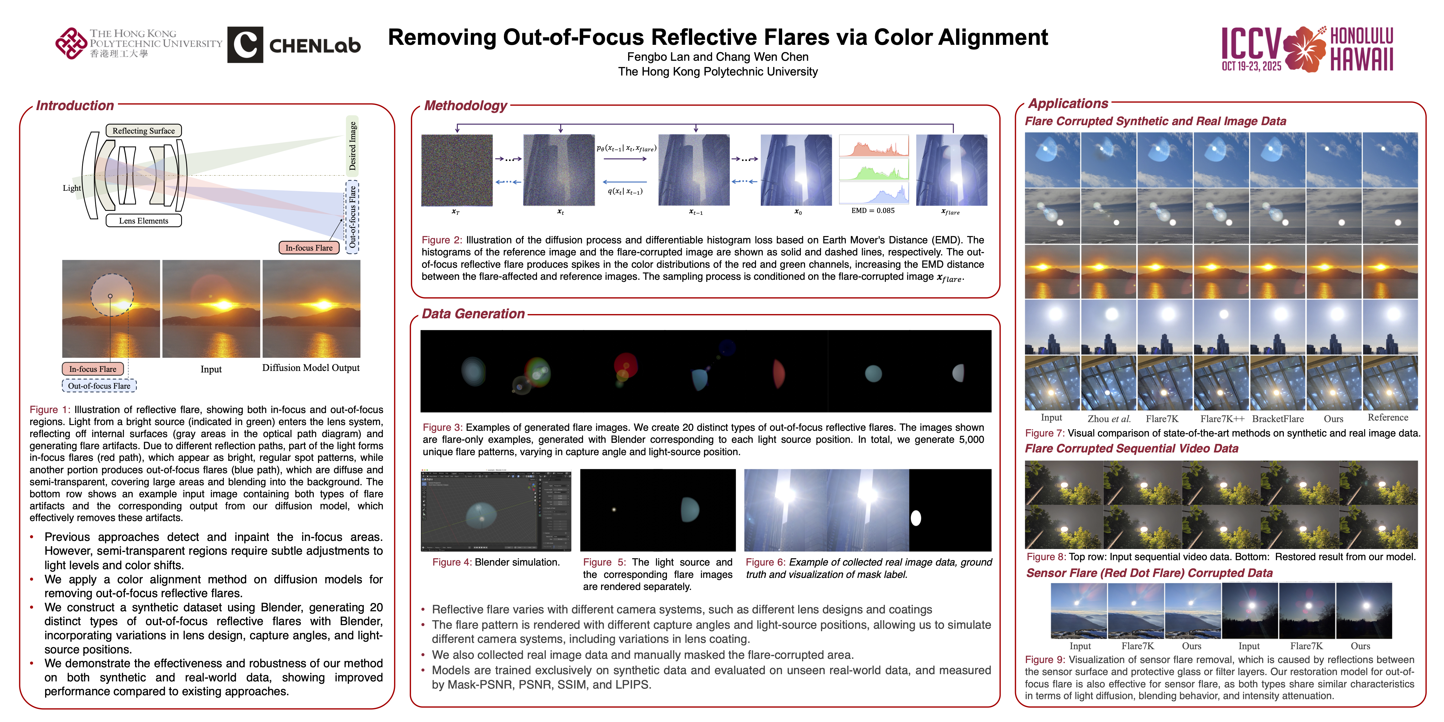 Reflective flares are common artifacts in photography that degrade image quality, introducing in-focus flares, which appear as bright, regular spot patterns, and out-of-focus flares, which are diffuse and semi-transparent, obscuring the underlying scene. While previous methods have achieved some success in removing in-focus flares, they struggle with the diffuse nature of out-of-focus flares. The lack of an out-of-focus flare dataset has further hindered the development of effective flare removal models. In this work, we construct a large-scale out-of-focus flare dataset generated based on physical principles. We propose a novel color alignment approach using diffusion models to address the challenges of out-of-focus reflective flare removal. Rather than reconstructing flare-affected regions, our method adjusts the color distribution to reduce artifact visibility while preserving image content. Specifically, we introduce a differentiable histogram loss, derived from the Earth Mover's Distance (EMD), to effectively align color distributions. The proposed approach outperforms existing methods on both synthetic and real-world data, demonstrating improved performance in flare removal.