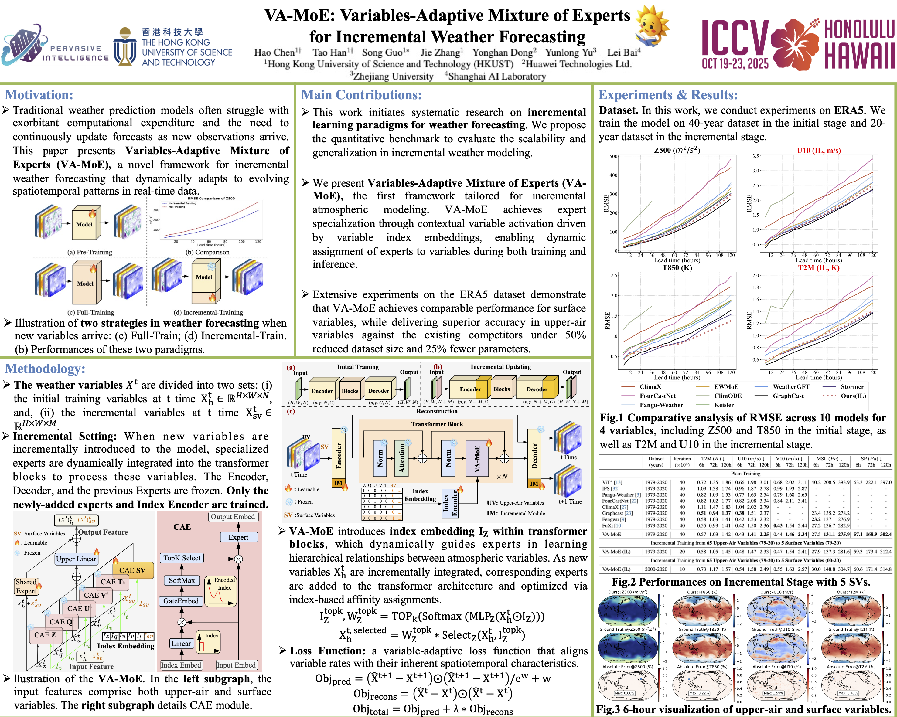 This paper presents Variables-Adaptive Mixture of Experts (VA-MoE), a novel framework for incremental weather forecasting that dynamically adapts to evolving spatiotemporal patterns in real-time data. Traditional weather prediction models often struggle with exorbitant computational expenditure and the need to continuously update forecasts as new observations arrive. VA-MoE addresses these challenges by leveraging a hybrid architecture of experts, where each expert specializes in capturing distinct sub-patterns of atmospheric variables (e.g., temperature, humidity, wind speed). Moreover, the proposed method employs a variable-adaptive gating mechanism to dynamically select and combine relevant experts based on the input context, enabling efficient knowledge distillation and parameter sharing. This design significantly reduces computational overhead while maintaining high forecast accuracy. Experiments on real-world ERA5 dataset demonstrate that VA-MoE performs comparable against state-of-the-art models in both short-term (e.g., 1–3 days) and long-term (e.g., 5 days) forecasting tasks, with only about 25\% of trainable parameters and 50\% of the initial training data.