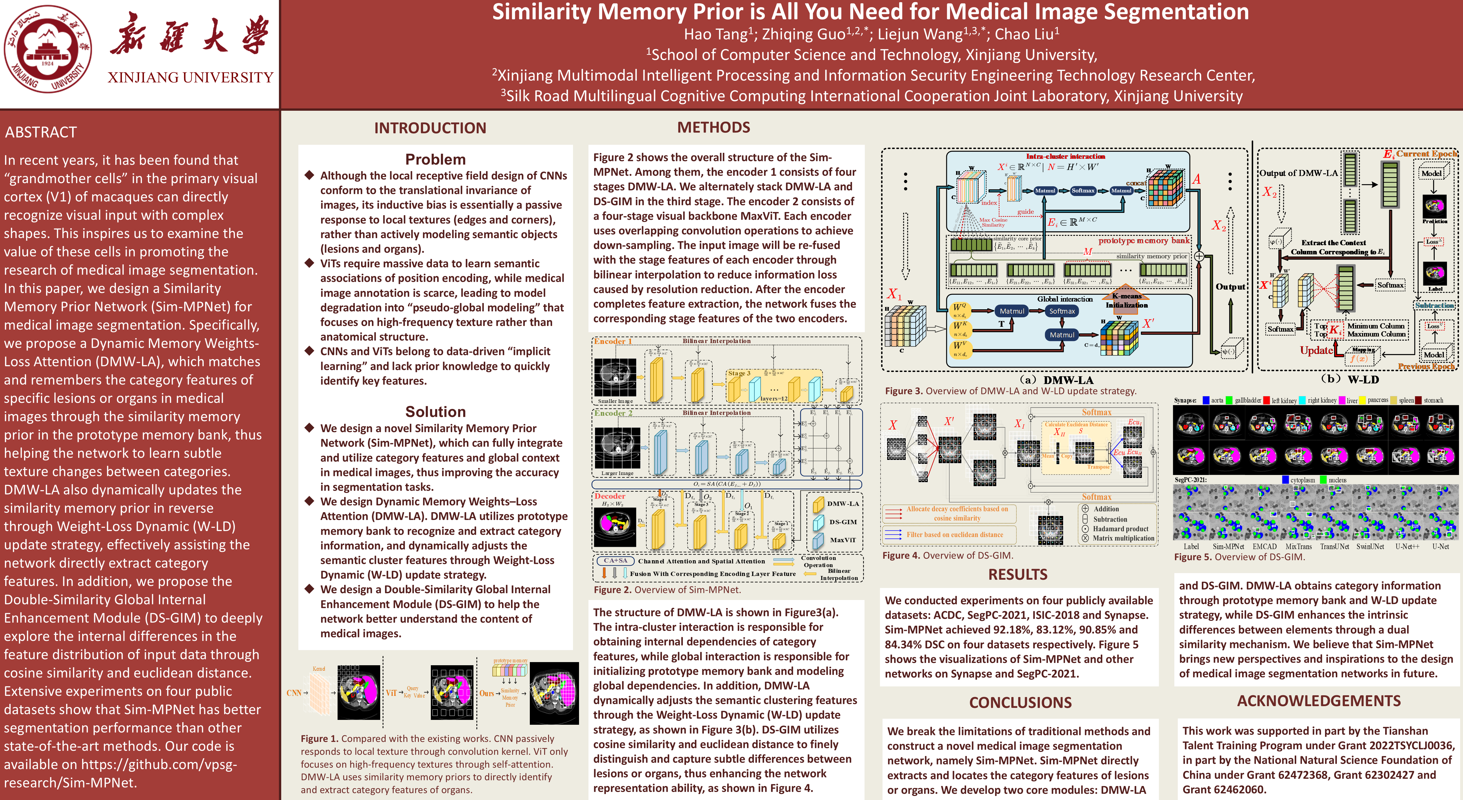In recent years, it has been found that “grandmother cells” in the primary visual cortex (V1) of macaques can directly recognize visual input with complex shapes. This inspires us to examine the value of these cells in promoting the research of medical image segmentation. In this paper, we design a Similarity Memory Prior Network (Sim-MPNet) for medical image segmentation. Specifically, we propose a Dynamic Memory Weights–Loss Attention (DMW-LA), which matches and remembers the category features of specific lesions or organs in medical images through the similarity memory prior in the prototype memory bank, thus helping the network to learn subtle texture changes between categories. DMW-LA also dynamically updates the similarity memory prior in reverse through Weight-Loss Dynamic (W-LD) update strategy, effectively assisting the network directly extract category features. In addition, we propose the Double-Similarity Global Internal Enhancement Module (DS-GIM) to deeply explore the internal differences in the feature distribution of input data through cosine similarity and euclidean distance. Extensive experiments on four public datasets show that Sim-MPNet has better segmentation performance than other state-of-the-art methods. Our code is available on https://anonymous.4open.science/r/Sim-MPNet.