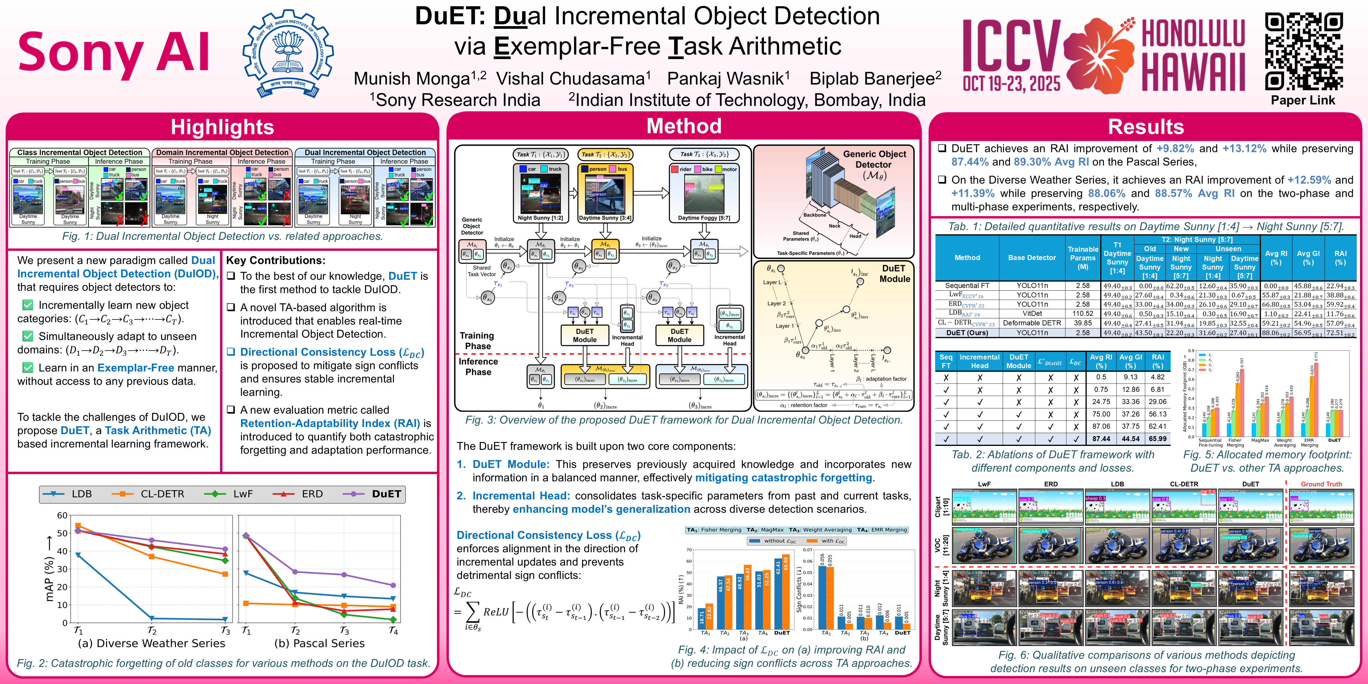 Real-world object detection systems, such as those in autonomous driving and surveillance, must continuously learn new object categories and simultaneously adapt to changing environmental conditions. Existing approaches, Class Incremental Object Detection (CIOD) and Domain Incremental Object Detection (DIOD)—only address one aspect of this challenge. CIOD struggles in unseen domains, while DIOD suffers from catastrophic forgetting when learning new classes, limiting their real-world applicability. To overcome these limitations, we introduce Dual Incremental Object Detection (DuIOD), a more practical setting that simultaneously handles class and domain shifts in an exemplar-free manner. We propose DuET, a Task Arithmetic-based model merging framework that enables stable incremental learning while mitigating sign conflicts through a novel Directional Consistency Loss. Unlike prior methods, DuET is detector-agnostic, allowing models like YOLO11 and RT-DETR to function as real-time incremental object detectors. To comprehensively evaluate both retention and adaptation, we introduce the Retention-Adaptability Index (RAI), which combines the Average Retention Index (Avg RI) for catastrophic forgetting and the Average Generalization Index for domain adaptability into a common ground. Extensive experiments on the Pascal Series and Diverse Weather Series demonstrate DuET’s effectiveness, achieving a +13.12\% RAI improvement while preserving 89.3\% Avg RI on the Pascal Series (4 tasks), as well as a +11.39\% RAI improvement with 88.57\% Avg RI on the Diverse Weather Series (3 tasks), outperforming existing methods.