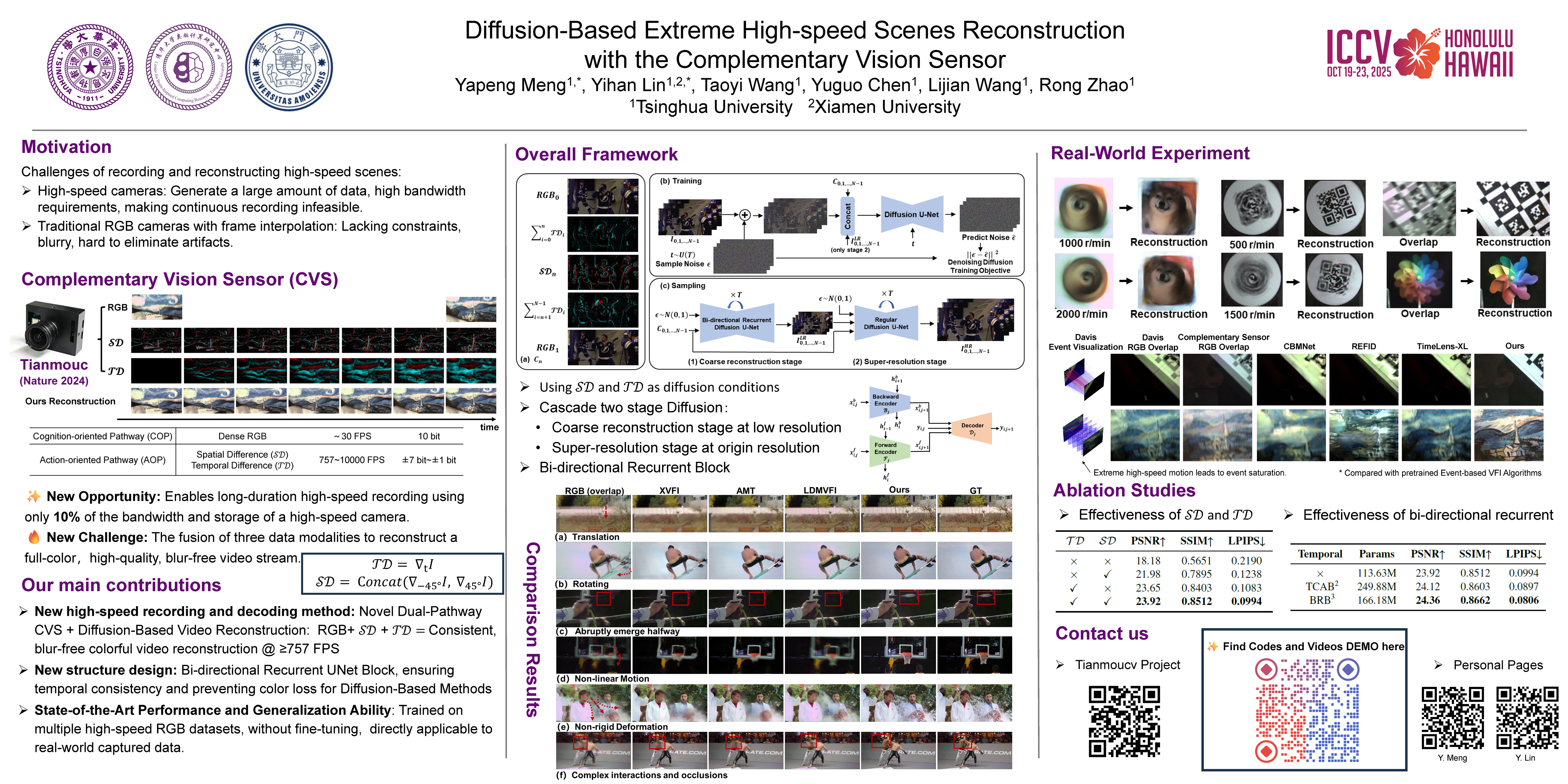 Recording and reconstructing high-speed scenes poses a significant challenge. The high bandwidth of high-speed cameras makes continuous recording unsustainable, while the frame interpolation methods using traditional RGB cameras (typically 30 fps) introduce artifacts and are affected by motion blur. Leveraging sensors inspired by the human visual system, such as event cameras, provides high-speed parse temporal variation or spatial variation data to alleviate the ill-conditioned problem of high-speed reconstructing with traditional RGB cameras. However, existing methods still suffer from RGB blur, temporal aliasing, and loss of event information. To overcome the above challenges, we leverage a novel dual-pathway complementary vision sensor, which outputs high-speed, sparse spatio-temporal differential frames between two RGB frames as reconstruction conditions. Further, we propose a cascaded bi-directional recurrent diffusion model (CBRDM) that can achieve accurate, sharp, color-rich video frames reconstruction results. Our method improves the LPIPS metric by 37.6% over state-of-the-art RGB interpolation algorithms and achieves superior performance in real-world comparisons with event cameras. Our code and dataset will be publicly available.