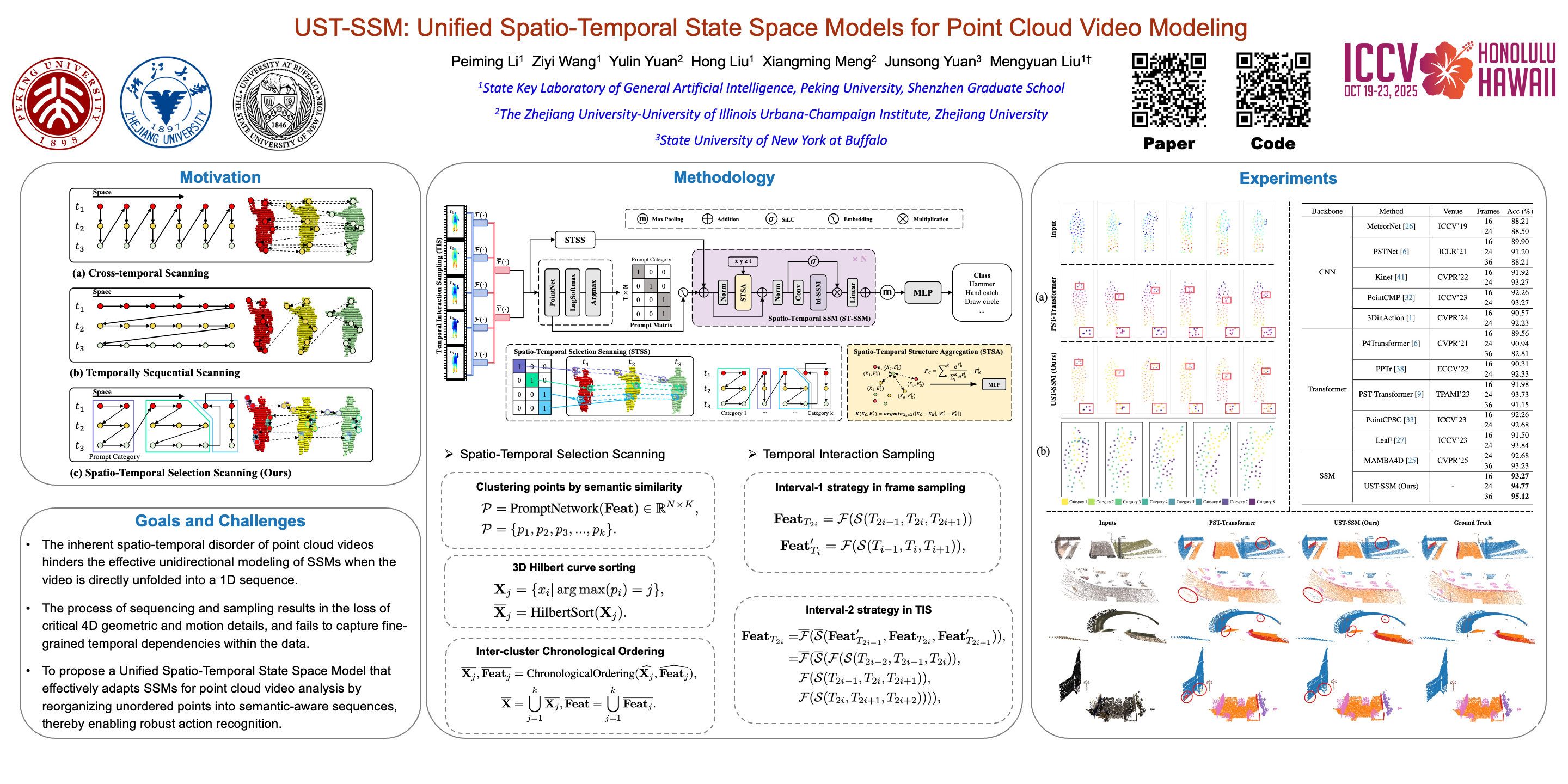 Point cloud videos capture dynamic 3D motion while reducing the effects of lighting and viewpoint variations, making them highly effective for recognizing subtle and continuous human actions. Although Selective State Space Models (SSMs) have shown good performance in sequence modeling with linear complexity, the spatio-temporal disorder of point cloud videos hinders their unidirectional modeling when directly unfolding the point cloud video into a 1D sequence through temporally sequential scanning. To address this challenge, we propose the Unified Spatio-Temporal State Space Model (UST-SSM), which extends the latest advancements in SSMs to point cloud videos. Specifically, we introduce Spatial-Temporal Selection Scanning (STSS), which reorganizes unordered points into semantic-aware sequences through prompt-guided clustering, thereby enabling the effective utilization of points that are spatially and temporally distant yet similar within the sequence. For missing 4D geometric and motion details, Spatio-Temporal Structure Aggregation (STSA) aggregates spatio-temporal features and compensates. To improve temporal interaction within the sampled sequence, Temporal Interaction Sampling (TIS) enhances fine-grained temporal dependencies through non-anchor frame utilization and expanded receptive fields. Experimental results on the MSR-Action3D, NTU RGB+D, and Synthia 4D datasets validate the effectiveness of our method. Our code is available at https://anonymous.4open.science/r/UST-SSM.