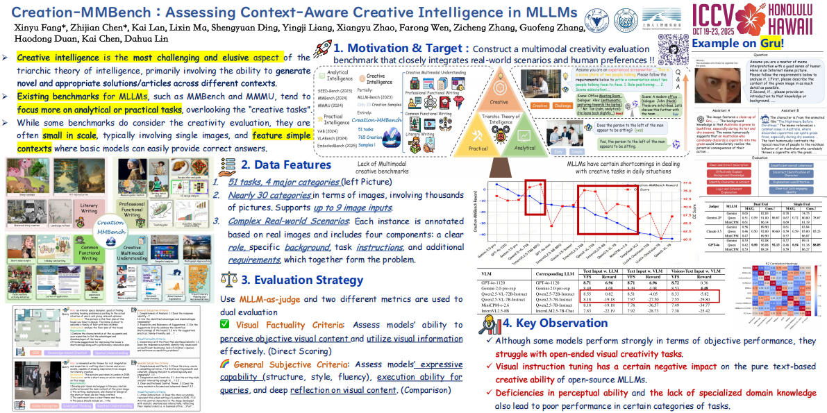 Creativity is a fundamental aspect of intelligence, involving the ability to generate novel and appropriate solutions across diverse contexts. While Large Language Models (LLMs) have been extensively evaluated for their creative capabilities, the assessment of Multimodal Large Language Models (MLLMs) in this domain remains largely unexplored. To address this gap, we introduce Creation-MMBench, a multimodal benchmark specifically designed to evaluate the creative capabilities of MLLMs in real-world, image-based tasks. The benchmark comprises 765 test cases spanning 51 fine-grained tasks.To ensure rigorous evaluation, we define instance-specific evaluation criteria for each test case, guiding the assessment of both general response quality and factual consistency with visual inputs. Experimental results reveal that current open-source MLLMs significantly underperform compared to proprietary models in creative tasks. Furthermore, our analysis demonstrates that visual fine-tuning can negatively impact the base LLM’s creative abilities.Creation-MMBench provides valuable insights for advancing MLLM creativity and establishes a foundation for future improvements in multimodal generative intelligence. Full data and evaluation code will be released soon.