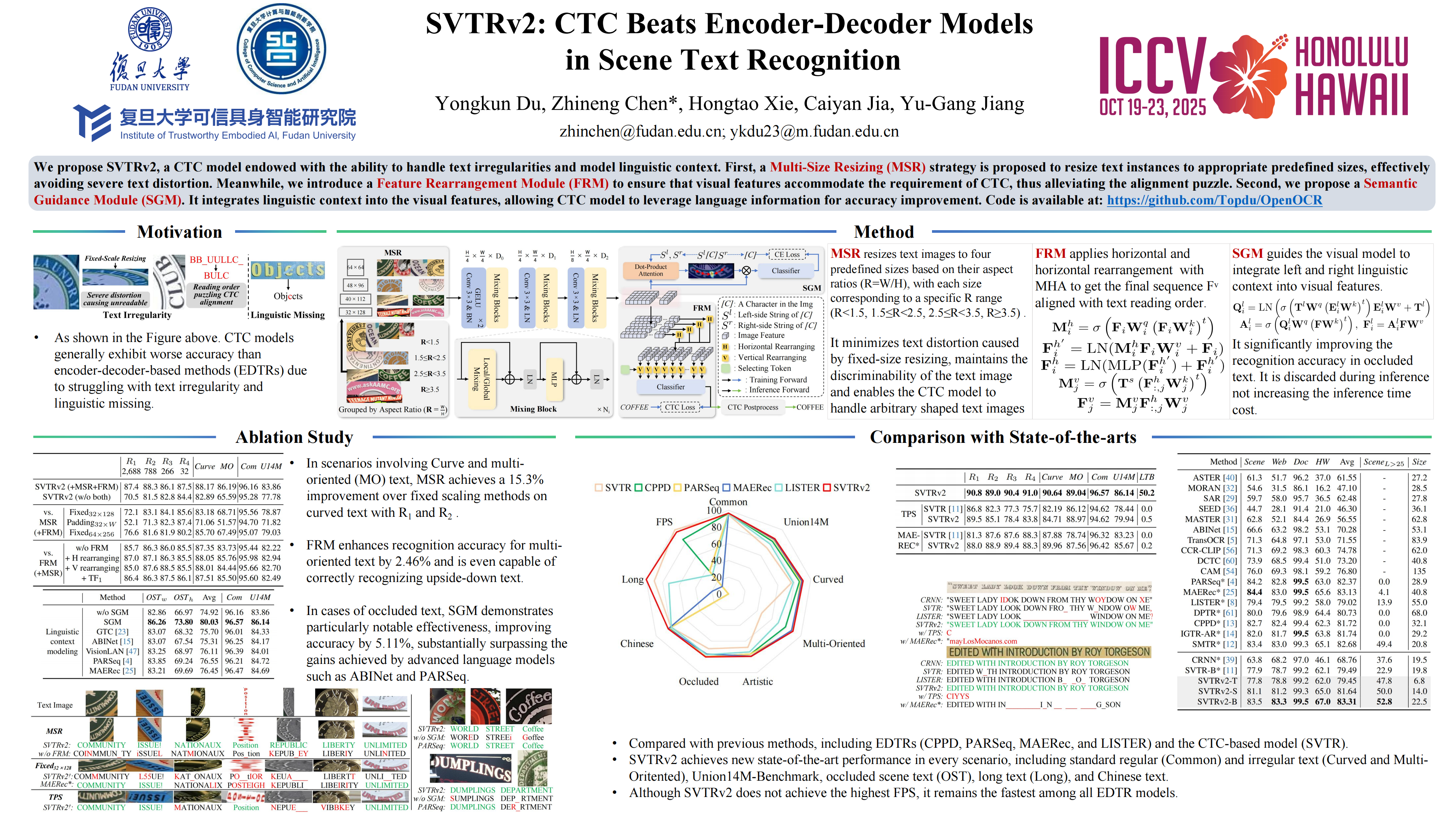 Connectionist temporal classification (CTC)-based scene text recognition (STR) methods, e.g., SVTR, are widely employed in OCR applications, mainly due to their simple architecture, which only contains a visual model and a CTC-aligned linear classifier, and therefore fast inference. However, they generally exhibit worse accuracy than encoder-decoder-based methods (EDTRs) due to struggling with text irregularity and linguistic missing. To address these challenges, we propose SVTRv2, a CTC model endowed with the ability to handle text irregularities and model linguistic context. First, a multi-size resizing strategy is proposed to resize text instances to appropriate predefined sizes, effectively avoiding severe text distortion. Meanwhile, we introduce a feature rearrangement module to ensure that visual features accommodate the requirement of CTC, thus alleviating the alignment puzzle. Second, we propose a semantic guidance module. It integrates linguistic context into the visual features, allowing CTC model to leverage language information for improved accuracy. Moreover, this module can be omitted at the inference stage and would not increase the time cost. We extensively evaluate SVTRv2 in both standard and recent challenging benchmarks, where SVTRv2 is fairly compared to mainstream STR models across multiple scenarios, including different types of text irregularity, languages, long text, and whether employing pretraining. The results indicate that SVTRv2 surpasses most EDTRs across the scenarios in terms of accuracy and inference speed.