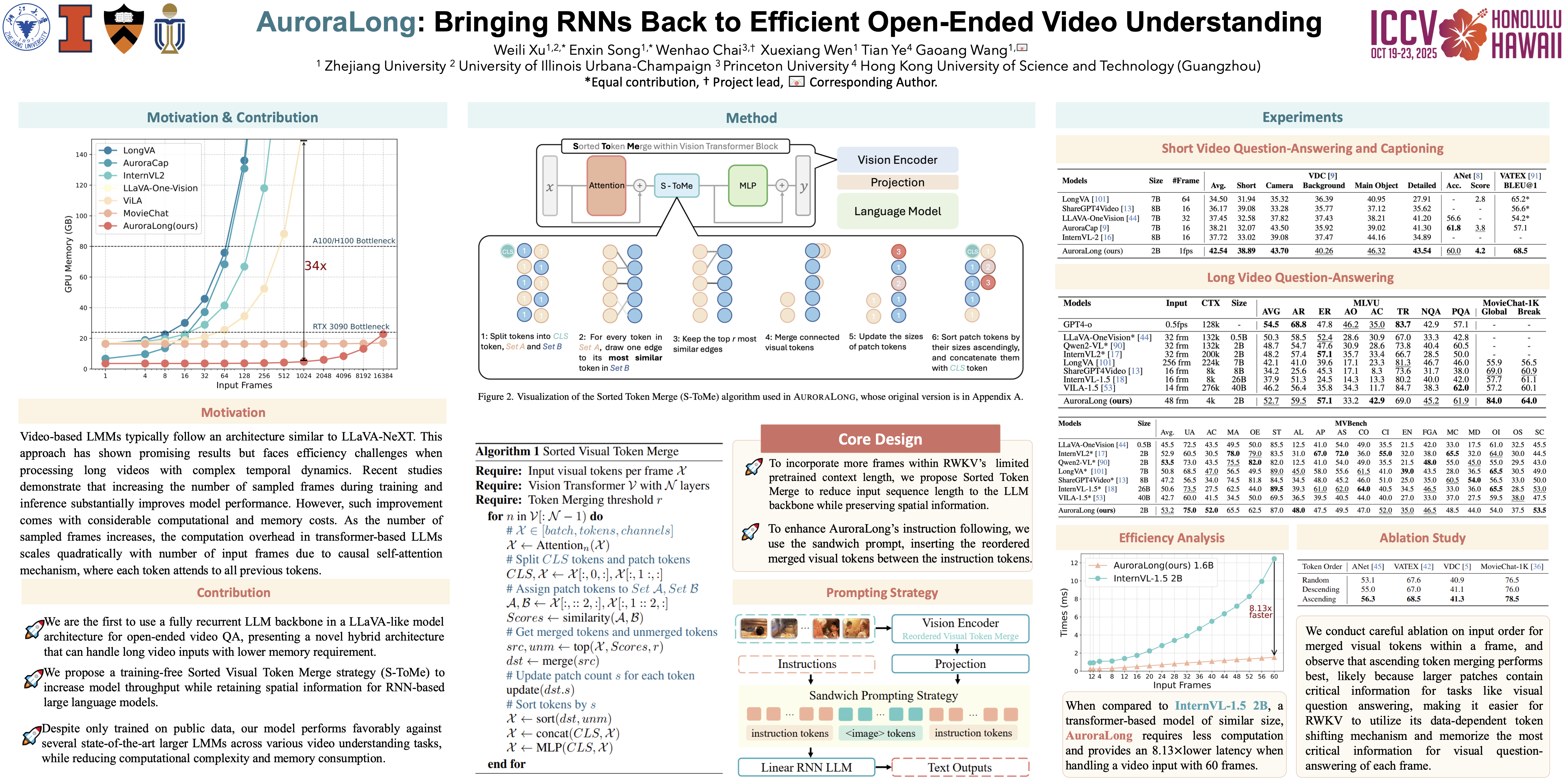 The challenge of long video understanding lies in its high computational complexity and prohibitive memory cost, since the memory and computation required by transformer-based LLMs scale quadratically with input sequence length. We propose AuroraLong to address this challenge by replacing the LLM component in MLLMs with RWKV, an RNN-like language model that handles input sequence of arbitrary length with constant-size hidden states. To further increase throughput and efficiency, as well as to reduce the gap between RWKV’s 4k context length and the extended token sequences typical of long videos, we combine visual token merge with linear RNN models by reordering the visual tokens by their sizes in ascending order. Despite having only 2B parameters and being trained exclusively on public data, AuroraLong achieves performance comparable to Transformer-based models of similar size trained on private datasets across multiple video benchmarks. This demonstrates the potential of efficient, linear RNNs to democratize long video understanding by lowering its computational entry barrier. To our best knowledge, we are the first to use a RWKV LLM backbone in a LLaVA-like model for open-ended video QA.