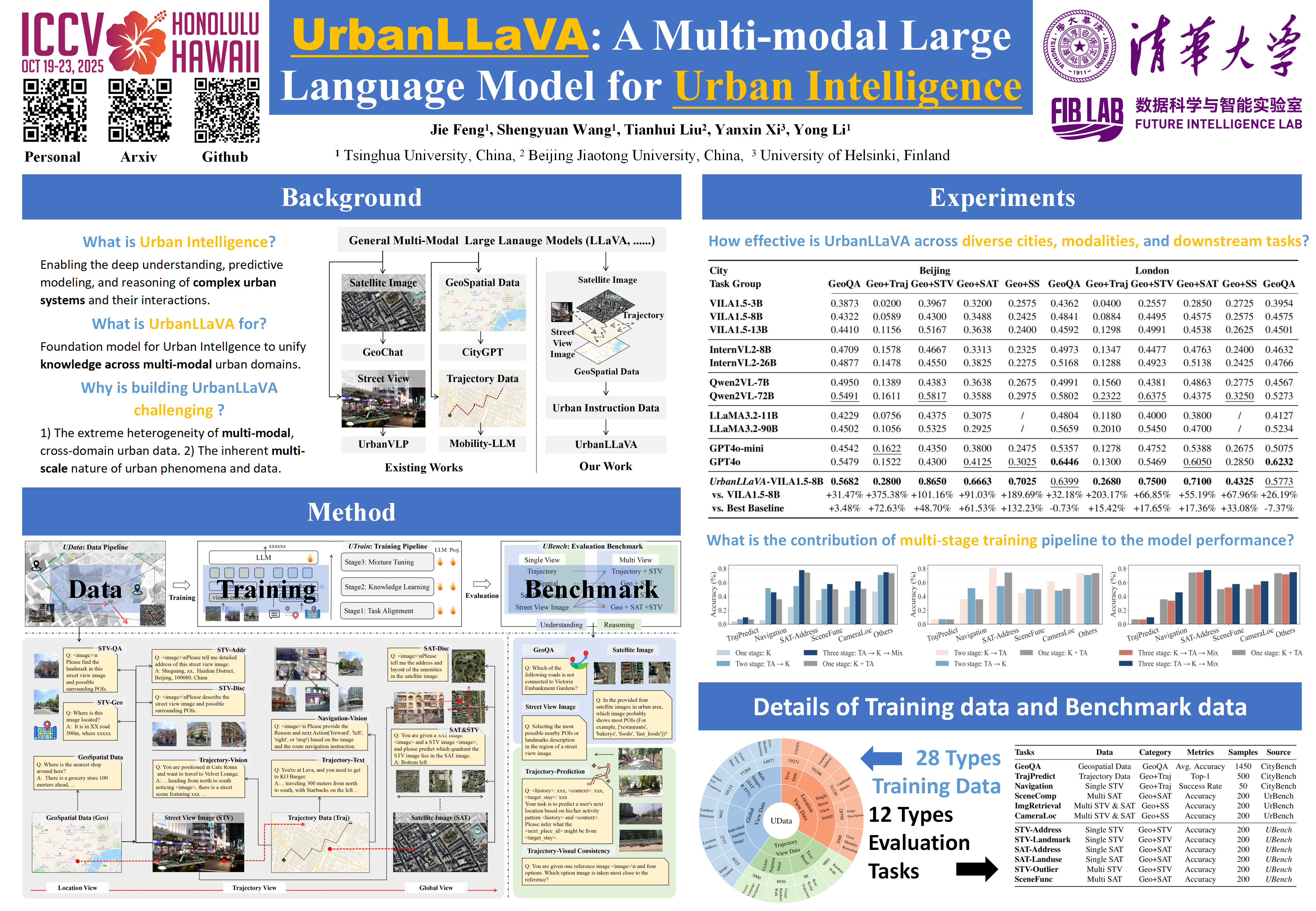 Urban research involves a wide range of scenarios and tasks that require the understanding of multi-modal data, such as structured geospatial data, trajectory data, satellite image data, and street view image data. Current methods often focus on specific data types and lack a unified framework in urban field for processing them comprehensively. The recent success of multi-modal large language models (MLLMs) presents a promising opportunity to overcome this limitation. In this paper, we introduce UrbanLLaVA, a multi-modal large language model designed to process these four types of data simultaneously and achieve strong performance across diverse urban tasks compared with general MLLMs. In UrbanLLaVA, we first curate a diverse urban instruction dataset encompassing both single-modal and cross-modal urban data, spanning from location view to global view of urban environment. Additionally, we design an effective multi-stage training pipeline to ensure the training stability and compatibility across various urban tasks. We also extend existing benchmark for urban research to assess the performance of MLLMs across a wide range of urban tasks. Experimental results from three cities demonstrate that UrbanLLaVA outperforms open source and commercial MLLMs in both single-modal tasks and complex cross-modal tasks and shows robust generalization abilities across cities. UrbanLLaVA sheds lights for building the unified foundation model with powerful perception and reasoning abilities for general urban intelligence.