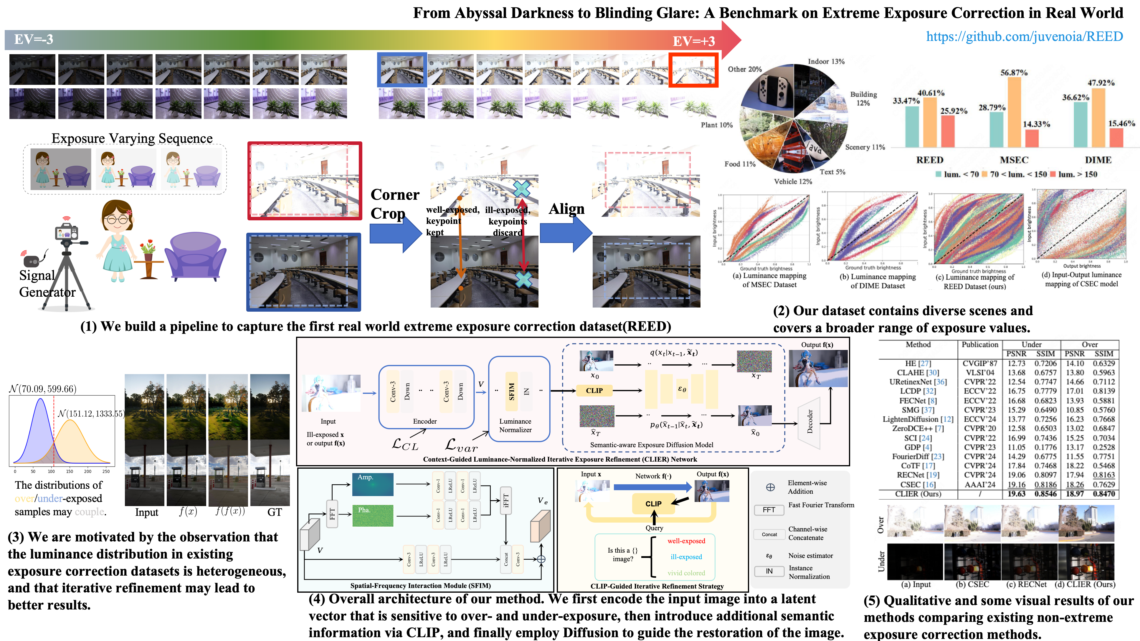 Exposure correction aims to restore over/under-exposed images to well-exposed ones using a single network. However, existing methods mainly handle non-extreme exposure conditions and struggle with the severe luminance and texture loss caused by extreme exposure. Through a thorough investigation, we find that the lack of high-quality benchmark datasets significantly limits progress in extreme exposure correction.To address this issue, we introduce the first Real-world Extreme Exposure Dataset, REED. By leveraging the burst shooting mode of cameras, we capture image sequences covering a luminance range from extremely dark to extremely bright. To prevent misalignment caused by camera motion and scene changes, we apply cropping and an improved SIFT algorithm to ensure precise alignment.We also propose a novel Context-Guided Luminance-Normalized Iterative Exposure Refinement Network. We employ Contrastive Loss and Luminance Normalizer to disentangle the coupled distribution of over/under-exposed images. In certain cases, luminance alone is insufficient for determining over/under-exposure, so we integrate semantic guidance into the Semantic-aware Exposure Diffusion Model to further enhance luminance and texture restoration. Inspired by the effectiveness of iterative correction in improving color and texture, we introduce the CLIP-Guided Iterative Refinement Strategy. Extensive experiments validate the superiority of our dataset and method. Our dataset and code will be publicly available.