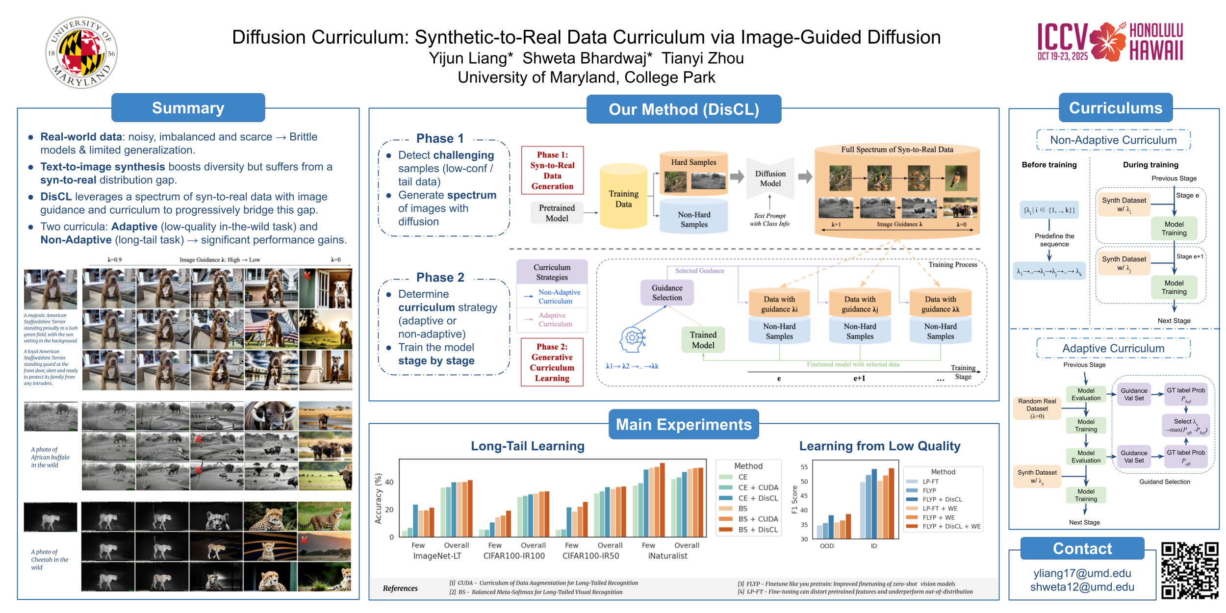 Low-quality or scarce data has posed significant challenges for training deep neural networks in practice. While classical data augmentation cannot contribute very different new data, diffusion models opens up a new door to build self-evolving AI by generating high-quality and diverse synthetic data through text-guided prompts. However, text-only guidance cannot control synthetic images' proximity to the original images, resulting in out-of-distribution data detrimental to the model performance. To overcome the limitation, we study image guidance to achieve a spectrum of interpolations between synthetic and real images. With stronger image guidance, the generated images are similar to the training data but hard to learn. While with weaker image guidance, the synthetic images will be easier for model but contribute to a larger distribution gap with the original data. The generated full spectrum of data enables us to build a novel "Diffusion CurricuLum (DisCL)". DisCL adjusts the image guidance level of image synthesis for each training stage: It identifies and focuses on hard samples for the model and assesses the most effective guidance level of synthetic images to improve hard data learning. We apply DisCL to two challenging tasks: long-tail (LT) classification and learning from low-quality data. It focuses on lower-guidance images of high-quality to learn prototypical features as a warm-up of learning higher-guidance images that might be weak on diversity or quality. Extensive experiments showcase a gain of 2.7% and 2.1% in OOD and ID macro-accuracy when applying DisCL to iWildCam dataset. On ImageNet-LT, DisCL improves the base model's tail-class accuracy from 4.4% to 23.64% and leads to a 4.02% improvement in all-class accuracy.