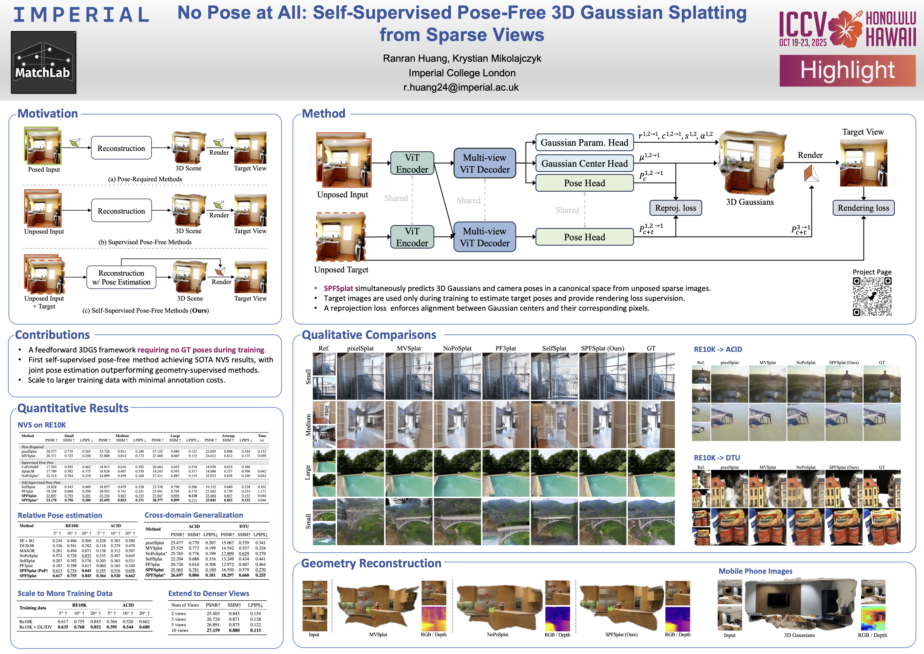 We introduce SPFSplat, an efficient framework for 3D Gaussian Splatting from sparse multi-view images, requiring no ground-truth poses during both training and inference. Our method simultaneously predicts Gaussians and camera poses from unposed images in a canonical space within a single feed-forward step. During training, the pose head estimate the poses at target views, which are supervised through the image rendering loss. Additionally, a reprojection loss is introduced to ensure alignment between Gaussians and the estimated poses of input views, reinforcing geometric consistency. This pose-free training paradigm and efficient one-step feed-forward inference makes SPFSplat well-suited for practical applications. Despite the absence of pose supervision, our self-supervised SPFSplat achieves state-of-the-art performance in novel view synthesis, even under significant viewpoint changes. Furthermore, it surpasses recent methods trained with geometry priors in relative pose estimation, demonstrating its effectiveness in both 3D scene reconstruction and camera pose learning.