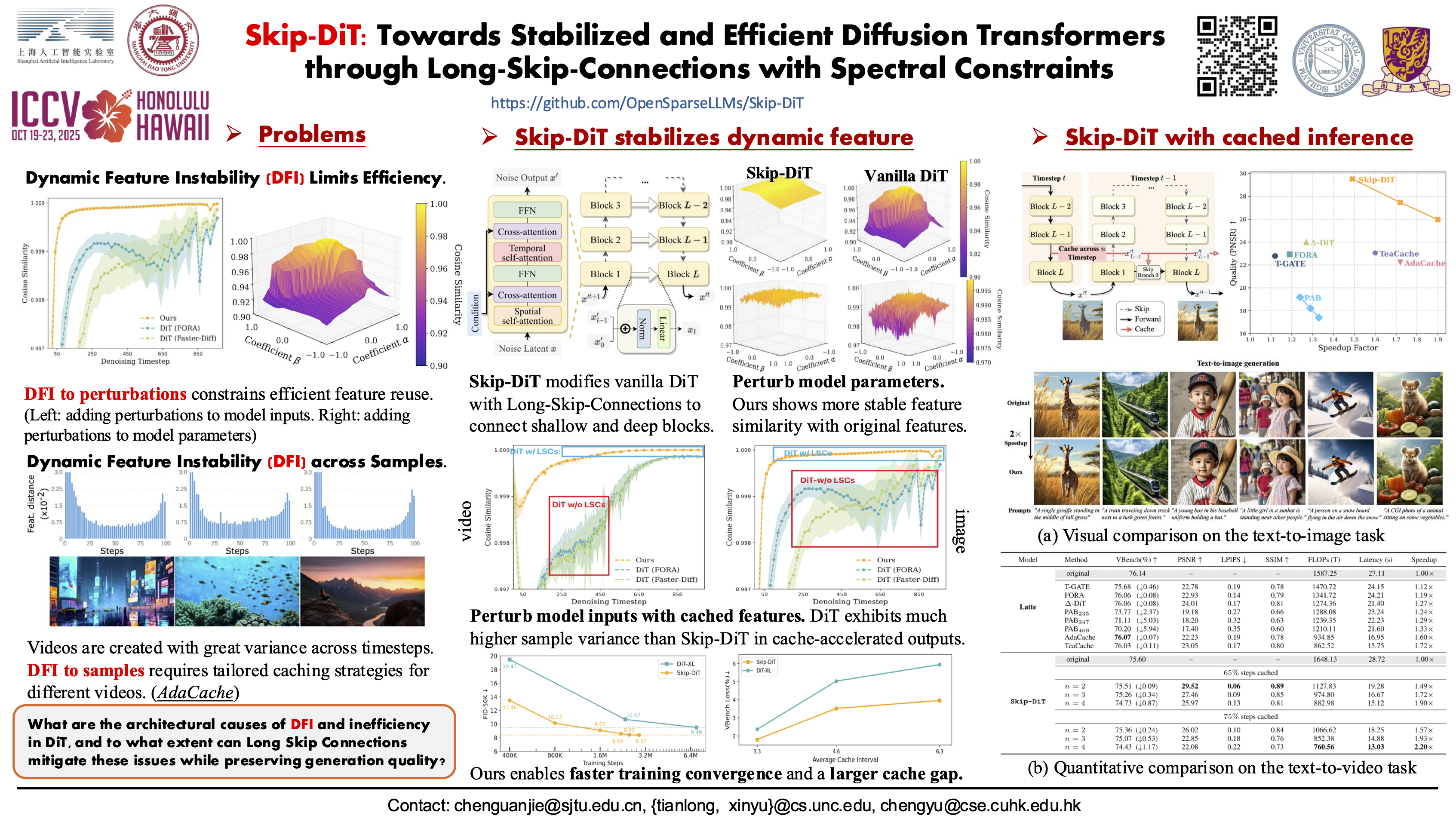 Diffusion Transformers (DiT) have emerged as a powerful architecture for image and video generation, offering superior quality and scalability. However, their practical application suffers from inherent dynamic feature instability, leading to error amplification during cached inference. Through systematic analysis, we identify the absence of long-range feature preservation mechanisms as the root cause of unstable feature propagation and perturbation sensitivity. To this end, we propose Skip-DiT, a novel DiT variant enhanced with Long-Skip-Connections (LSCs) - the key efficiency component in U-Nets. Theoretical spectral norm and visualization analysis demonstrate how LSCs stabilize feature dynamics. Skip-DiT architecture and its stabilized dynamic feature enable an efficient statical caching mechanism that reuses deep features across timesteps while updating shallow components. Extensive experiments across image and video generation tasks demonstrate that Skip-DiT achieves: (1) **4.4$\times$** training acceleration and faster convergence, (2) **1.5-2$\times$** inference acceleration without quality loss and high fidelity to original output, outperforming existing DiT caching methods across various quantitative metrics. Our findings establish long-skip connections as critical architectural components for training stable and efficient diffusion transformers. Codes are provided in the anonymous URL https://anonymous.4open.science/r/Skip-DiT-72B7/.