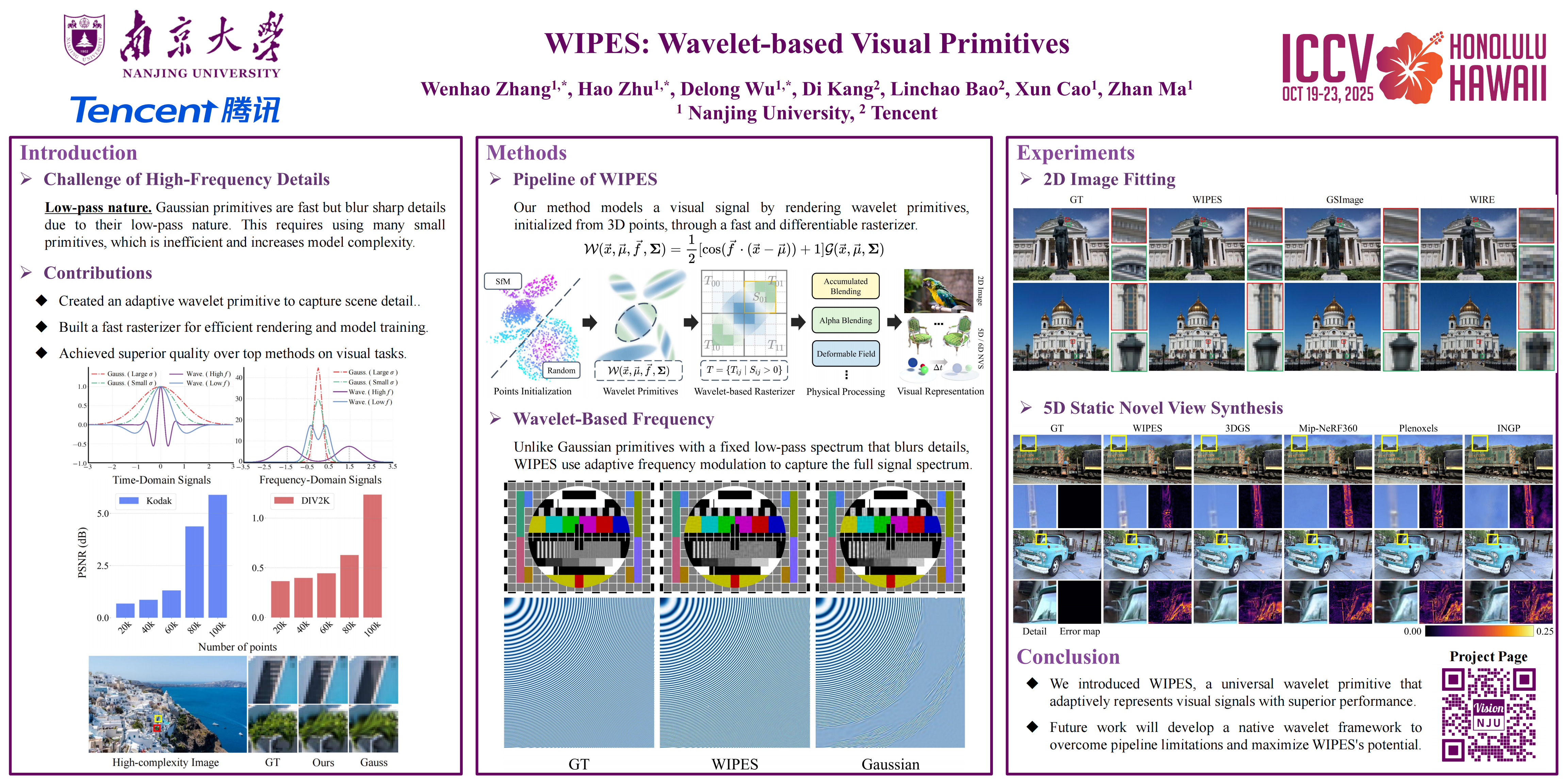 Pursuing a continuous visual representation that offers flexible frequency modulation and fast rendering speed has recently garnered increasing attention in the fields of 3D vision and graphics. However, existing representations often rely on frequency guidance or complex neural network decoding, leading to spectrum loss or slow rendering. To address these limitations, we propose WIPES, a universal Wavelet-based vIsual PrimitivES for representing multi-dimensional visual signals. Building on the spatial-frequency localization advantages of wavelets, WIPES effectively captures both the low-frequency "forest" and the high-frequency "trees." Additionally, we develop a wavelet-based differentiable rasterizer to achieve fast visual rendering. Experimental results on various visual tasks, including 2D image representation, 5D static and 6D dynamic novel view synthesis, demonstrate that WIPES, as a visual primitive, offers higher rendering quality and faster inference than INR-based methods, and outperforms Gaussian-based representations in rendering quality.