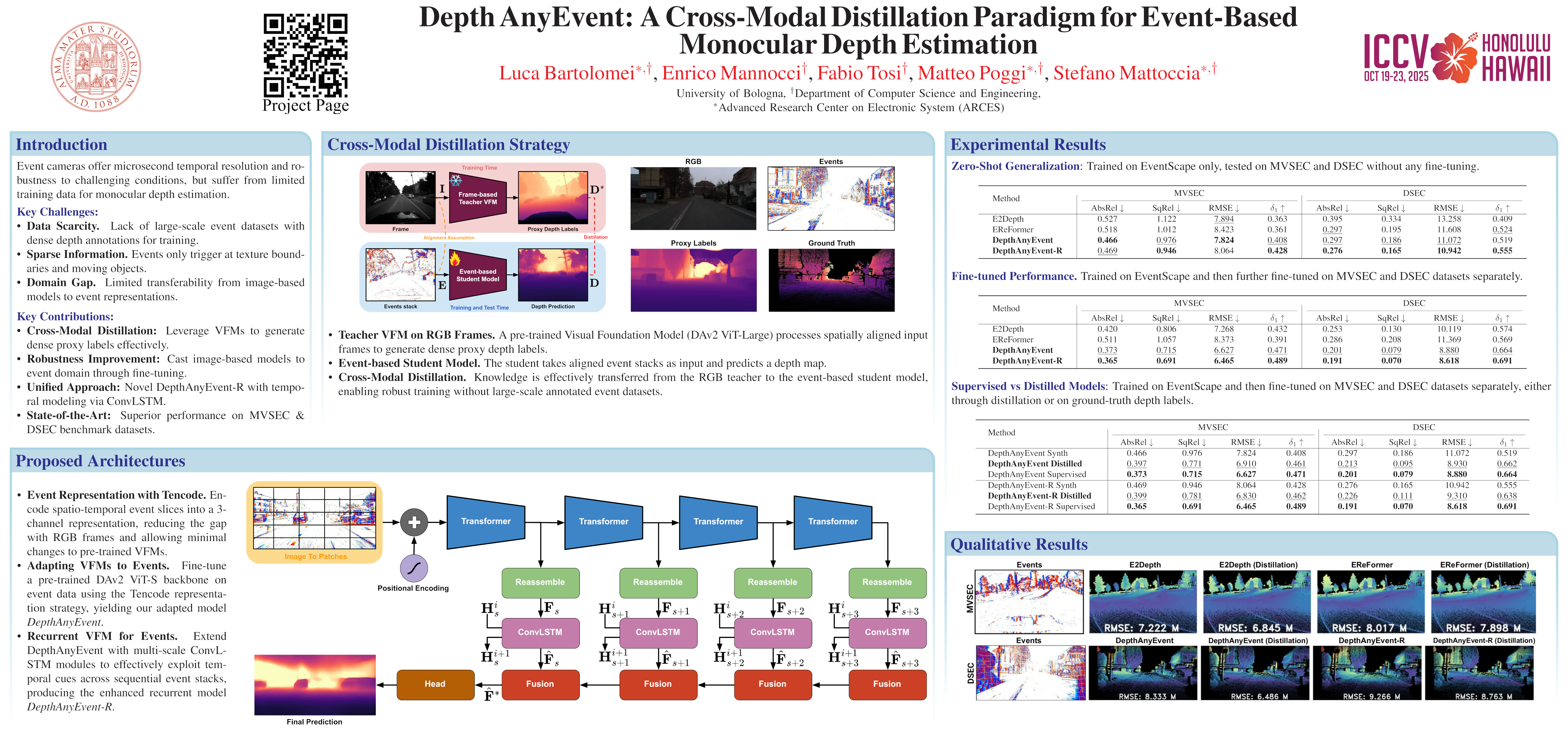 Event cameras capture sparse, high-temporal-resolution visual information, making them particularly suitable for challenging environments with high-speed motion and strongly varying lighting conditions. However, the lack of large datasets with dense ground-truth depth annotations hinders learning-based monocular depth estimation from event data. To address this limitation, we propose a cross-modal distillation paradigm to generate dense proxy labels leveraging a Vision Foundation Model (VFM). Our strategy requires an event stream spatially aligned with RGB frames, a simple setup even available off-the-shelf, and exploits the robustness of large-scale VFMs.Additionally, we propose to adapt VFMs, either a vanilla one like Depth Anything v2 (DAv2), or deriving from it a novel recurrent architecture to infer depth from monocular event cameras. We evaluate our approach using synthetic and real-world datasets, demonstrating that i) our cross-modal paradigm achieves competitive performance compared to fully supervised methods without requiring expensive depth annotations, and ii) our VFM-based models achieve state-of-the-art performance