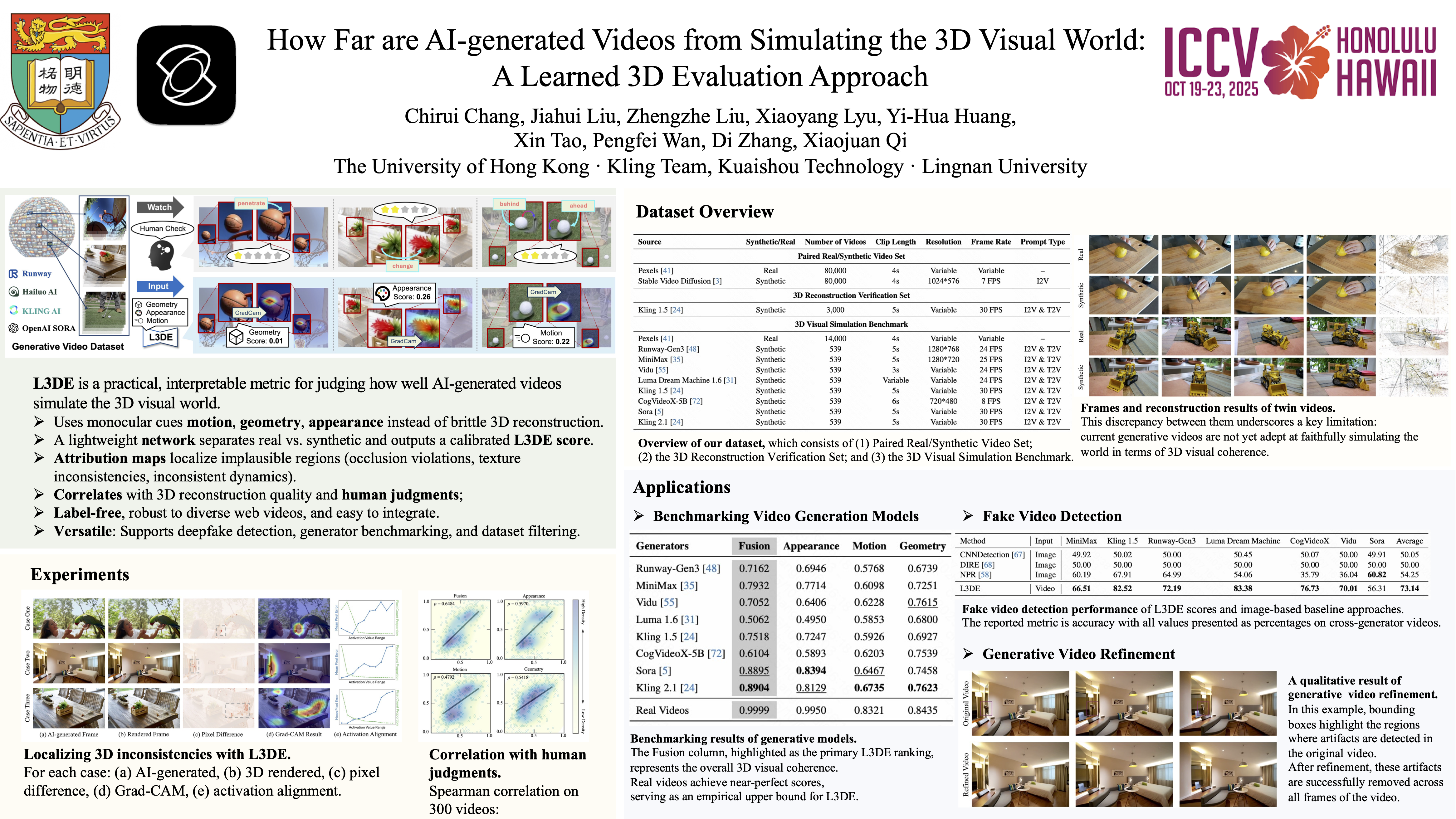 Recent advancements in video diffusion models enable the generation of photorealistic videos with impressive 3D consistency and temporal coherence. However, the extent to which these AI-generated videos simulate the 3D visual world remains underexplored. In this paper, we introduce Learned 3D Evaluation (L3DE), an objective, quantifiable, and interpretable method for assessing AI-generated videos’ ability to simulate the real world in terms of 3D visual qualities and consistencies, without requiring manually labeled defects or quality annotations. Instead of relying on 3D reconstruction, which is prone to failure with in-the-wild videos, L3DE employs a 3D convolutional network, trained on monocular 3D cues of motion, depth, and appearance, to distinguish real from synthetic videos. Confidence scores from L3DE quantify the gap between real and synthetic videos in terms of 3D visual coherence, while a gradient-based visualization pinpoints unrealistic regions, improving interpretability. We validate L3DE through extensive experiments, demonstrating strong alignment with 3D reconstruction quality and human judgments. Our evaluations on leading generative models (e.g., Sora, MiniMax, and Kling) reveal persistent simulation gaps and subtle inconsistencies. Beyond generative video assessment, L3DE extends to broader applications: benchmarking video generation models, serving as a deepfake detector, and enhancing video synthesis by inpainting flagged inconsistencies.