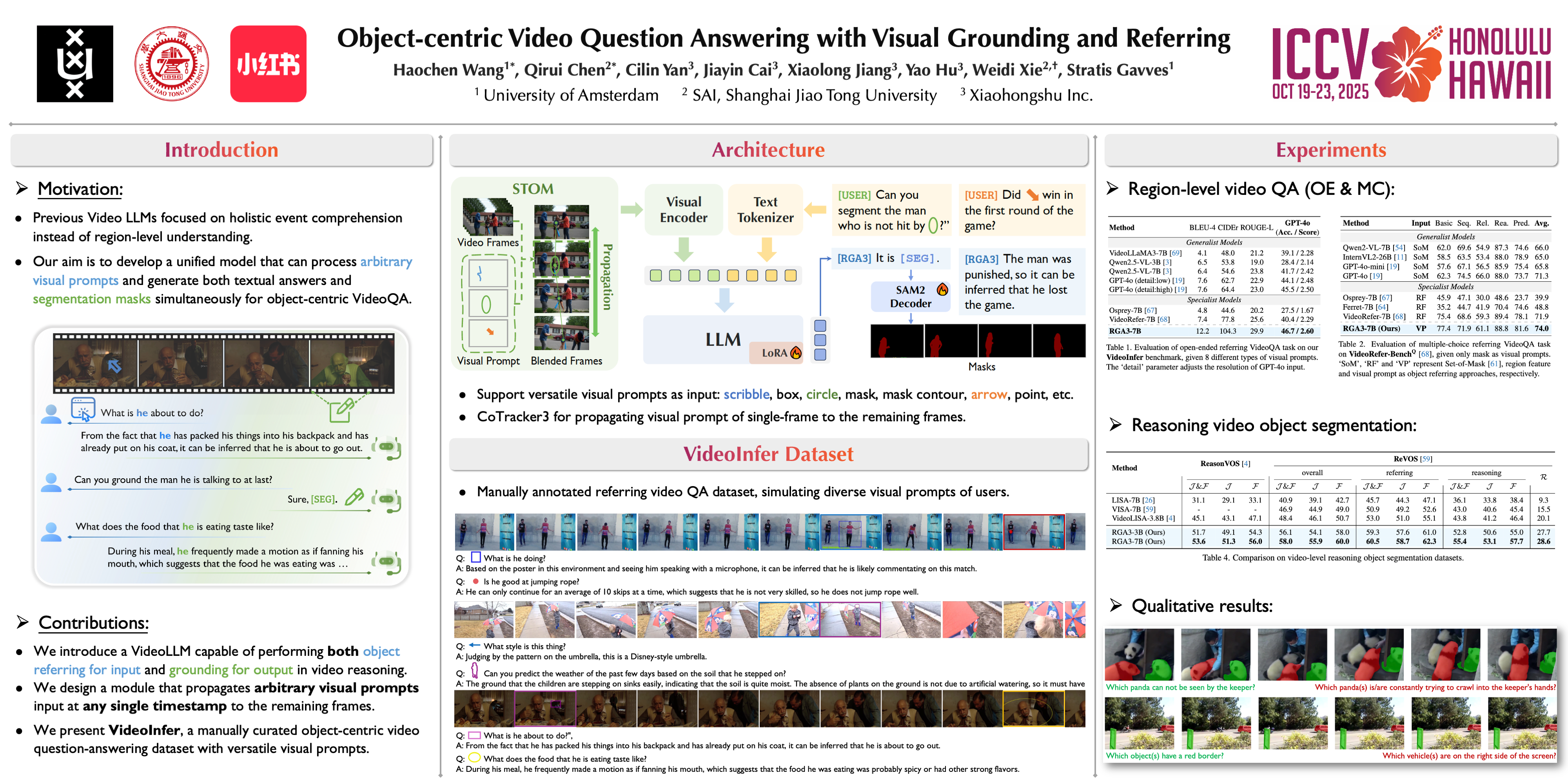 Video Large Language Models (VideoLLMs) have recently demonstrated remarkable progress in general video understanding. However, existing models primarily focus on high-level comprehension and are limited to text-only responses, restricting the flexibility for object-centric, multi-round interactions. In this paper, we make three contributions:(i) we address these limitations by introducing a VideoLLM, termed as RGA3, capable of performing both object referring and grounding for video reasoning tasks in a multi-round conversational manner, i.e., allowing users to iteratively interact with videos using both textual and visual queries; (ii) we propose STOM (Spatial-Temporal Overlay Module), a novel approach that allows arbitrary visual prompts to be processed at any timestamp within a video;(iii) we present VideoInfer, a manually curated object-centric video instruction dataset featuring question-answering pairs that require reasoning. We conduct comprehensive experiments on VideoInfer and other existing benchmarks across video question answering and referring video object segmentation. The results on 12 benchmarks spanning 6 tasks show that RGA3 consistently outperforms baseline models in both video question answering and segmentation, underscoring its robustness in multimodal, object-centric video and image understanding. The code, dataset, and web demo will be publicly released.