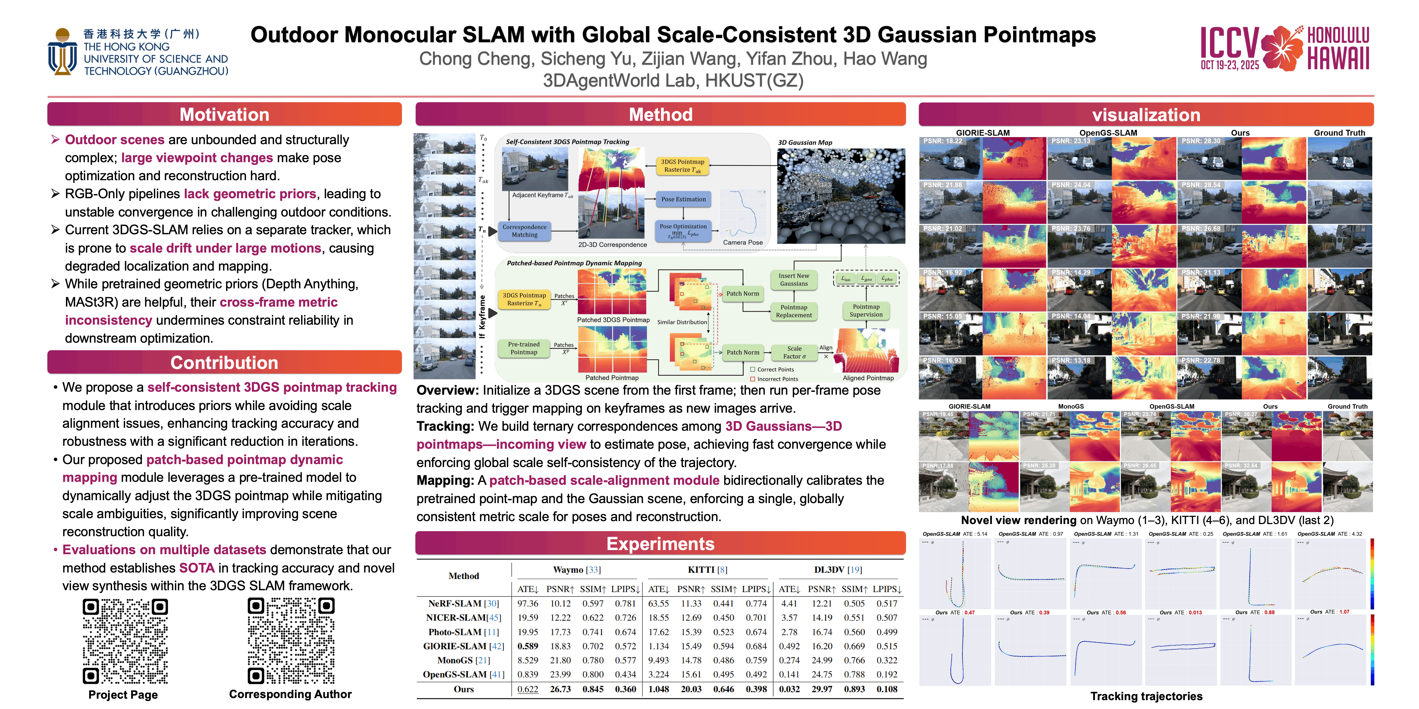 Outdoor Monocular SLAM with Global Scale-Consistent 3D Gaussian Pointmaps