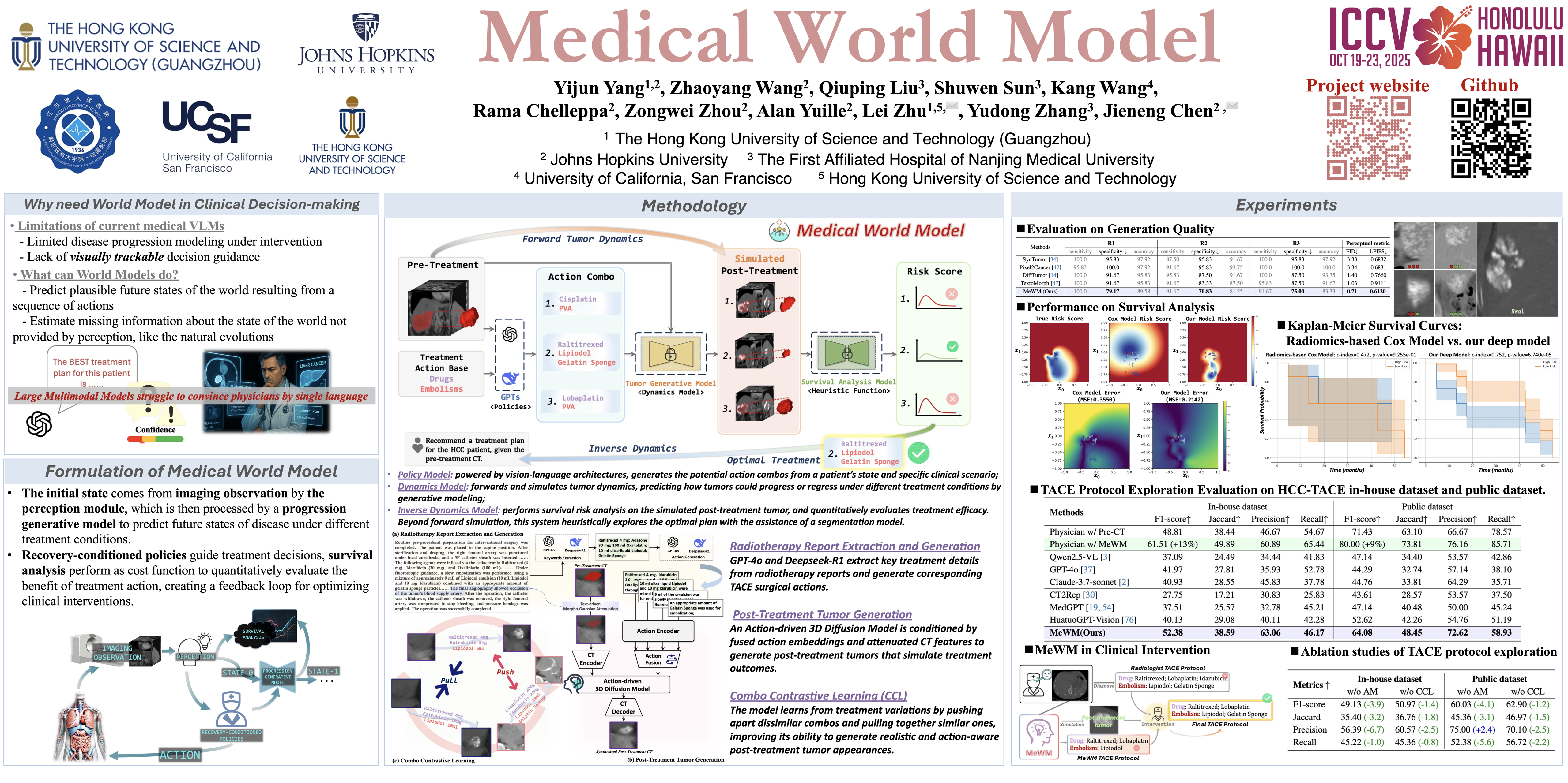 Providing effective treatment and making informed decisions are essential goals of modern medicine and clinical care.We are interested in simulating disease dynamics for clinical decision-making, leveraging recent advances in large generative models.To this end, we introduce the Medical World Model (MeWM), the first world model in medicine that predicts future disease states based on clinical decisions. MeWM comprises (i) vision-language models to serve as policy models, and (ii) tumor generative models as dynamics models. The policy model generates action plans, such as clinical treatments, while the dynamics model simulates tumor progression or regression under given treatment conditions. Building on this, we propose the inverse dynamics model that applies survival analysis to the simulated post-treatment tumor, enabling the evaluation of treatment efficacy and the selection of the optimal clinical action plan. As a result, the proposed MeWM simulates disease dynamics by synthesizing post-treatment tumors, with state-of-the-art specificity in Turing tests evaluated by radiologists. Simultaneously, its inverse dynamics model outperforms medical-specialized GPTs in optimizing individualized treatment protocols across all metrics.Notably, MeWM improves clinical decision-making for interventional physicians, boosting F1-score in selecting the optimal TACE protocol by 13\%, paving the way for future integration of medical world models as the second readers.