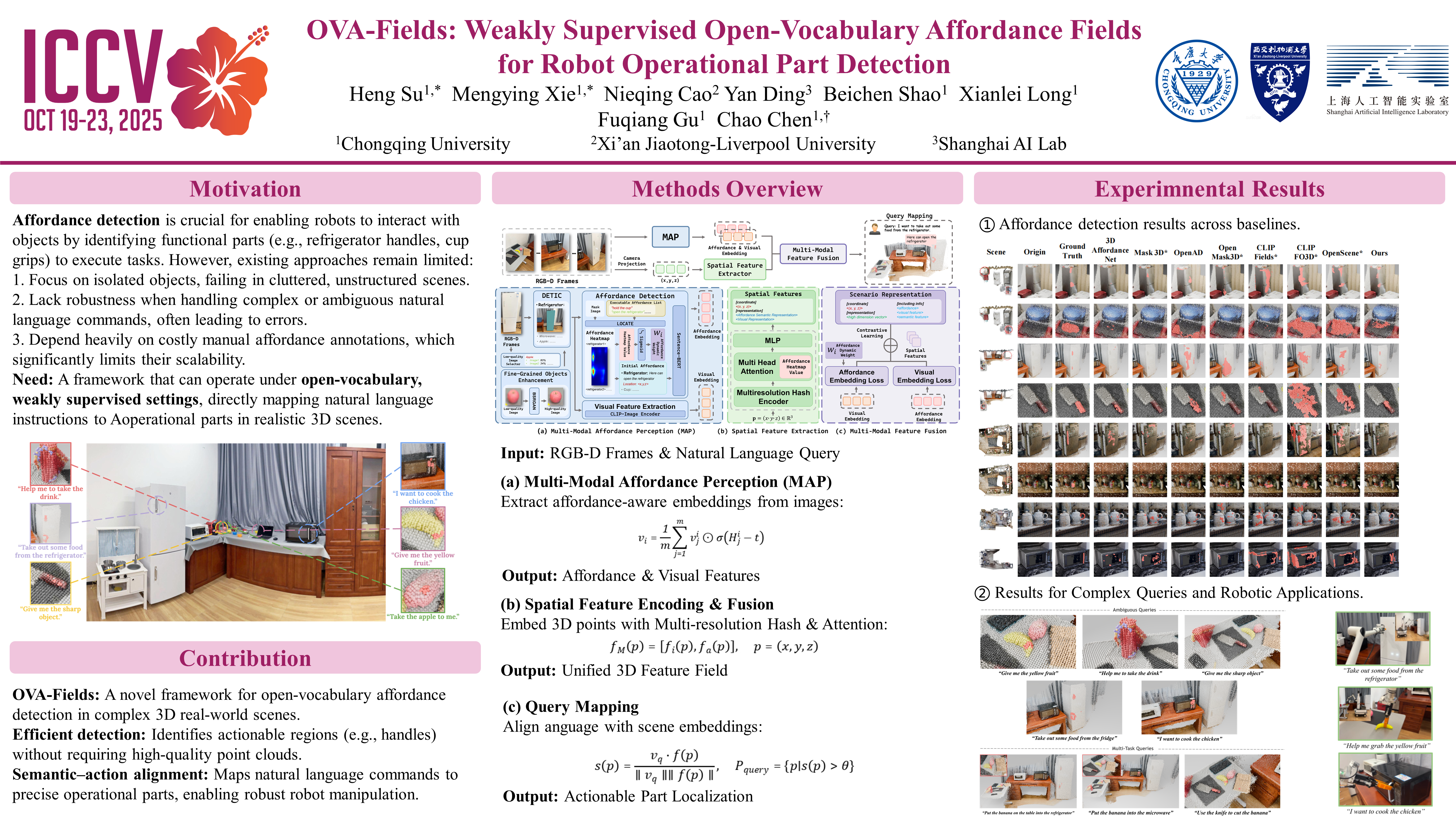 In recent years, affordance detection has become essential for robotic manipulation in real-world scenes, where robots must autonomously interpret commands and perform actions. Current methods often focus on individual point cloud objects or simple semantic queries, limiting their effectiveness in diverse scenes and complex instructions. To address this, we introduce OVA-Fields, a framework for affordance detection in 3D scenes with complex semantics. By integrating multilevel geometric encoding and enhanced semantic affordance embeddings, OVA-Fields maps user commands directly to operational parts, embedding enriched affordance information into the 3D scene. Experimental results demonstrate that OVA-Fields achieves 52.4\% mIoU on complex semantic real-world scenes and 90\% success rate in real-world robot manipulation tasks (e.g., "take out some food from the refirgerator") using RGB-D sensing. Our approach enables the precise identification of operational parts, transforming natural language queries into targeted manipulations in real-world environments.