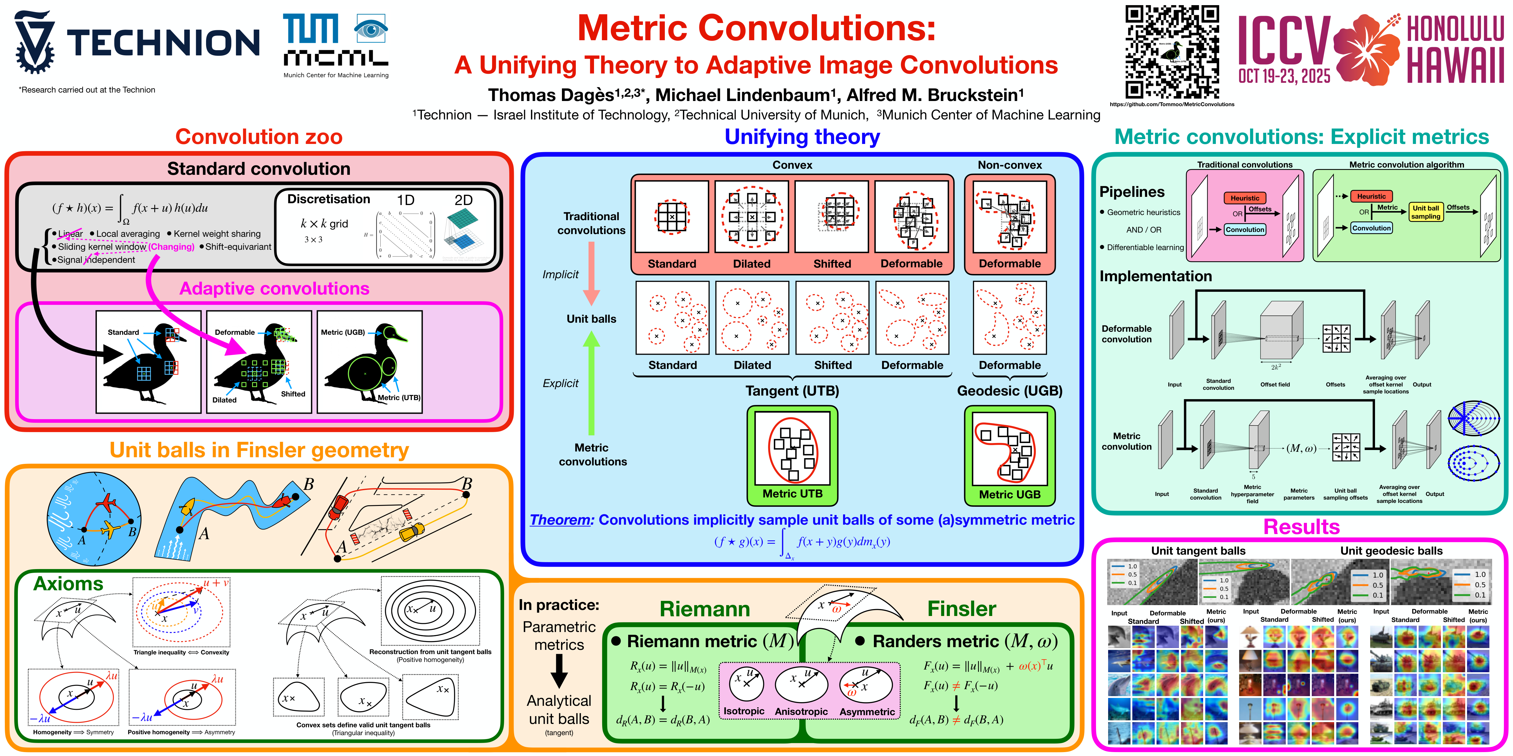 Standard convolutions are prevalent in image processing and deep learning, but their fixed kernels limits adaptability. Several deformation strategies of the reference kernel grid have been proposed. Yet, they lack a unified theoretical framework. By returning to a metric perspective for images, now seen as two-dimensional manifolds equipped with notions of local and geodesic distances, either symmetric (Riemannian) or not (Finsler), we provide a unifying principle: the kernel positions are samples of unit balls of implicit metrics. With this new perspective, we also propose metric convolutions, a novel approach that samples unit balls from explicit signal-dependent metrics, providing interpretable operators with geometric regularisation. This framework, compatible with gradient-based optimisation, can directly replace existing convolutions applied to either input images or deep features of neural networks. Metric convolutions typically require fewer parameters and provide better generalisation. Our approach shows competitive performance in standard denoising and classification tasks.