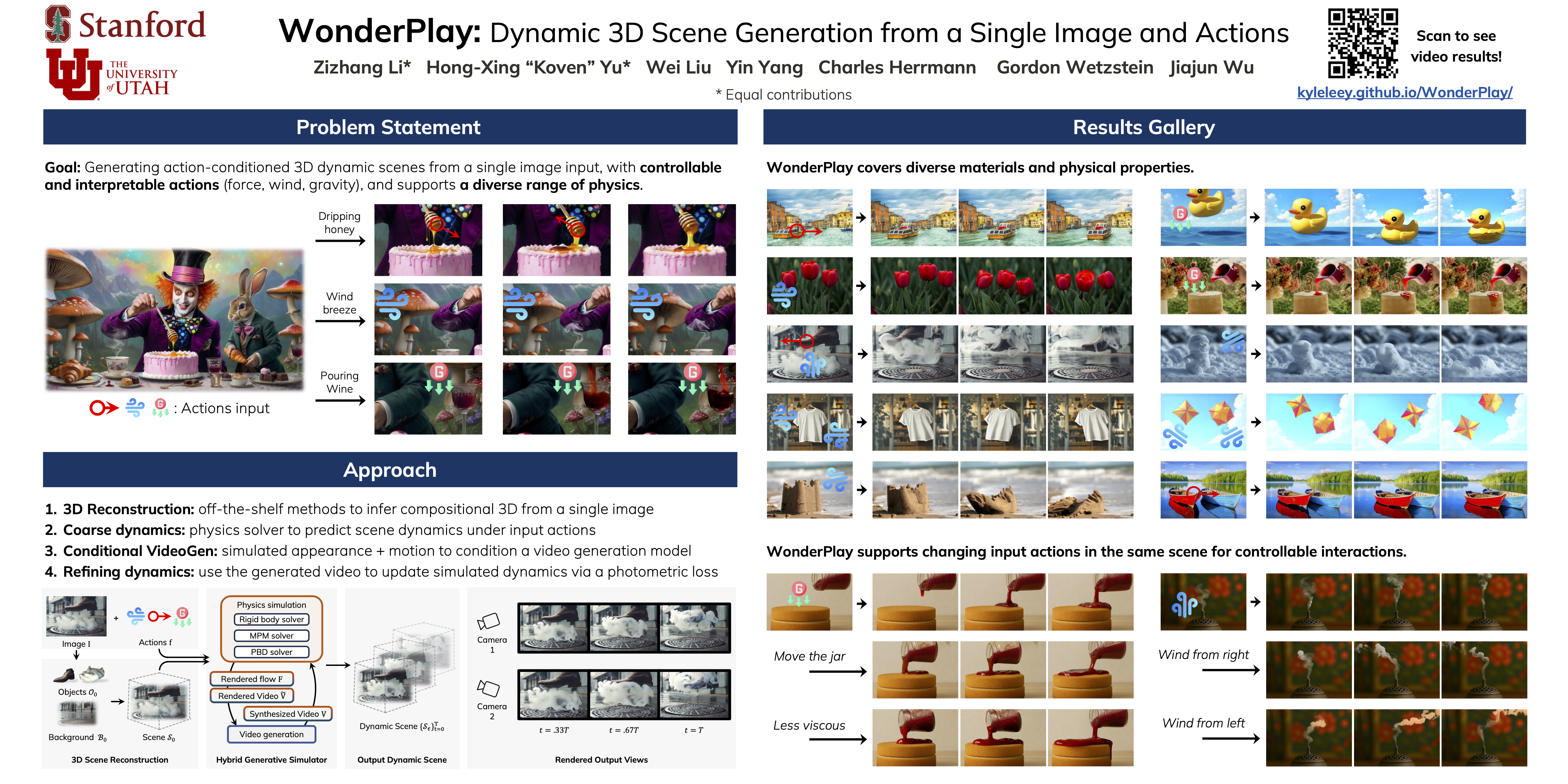WonderPlay is a novel framework integrating physics simulation with video generation for generating action-conditioned dynamic 3D scenes from a single image. Our hybrid generative simulator first uses a physics solver to simulate coarse 3D dynamics, which subsequently conditions a video generator to produce a video with finer, more realistic motion. The generated video is then used to update the simulated dynamic 3D scene, closing the loop between the physics solver and the video generator. This approach enables intuitive user control to be combined with the accurate dynamics of physics-based simulators and the expressivity of diffusion-based video generators. Experimental results demonstrate that WonderPlay enables users to interact with various scenes of diverse content, including cloth, sand, snow, liquid, smoke, elasticity, and rigid bodies -- all using a single image input. Code will be made public.