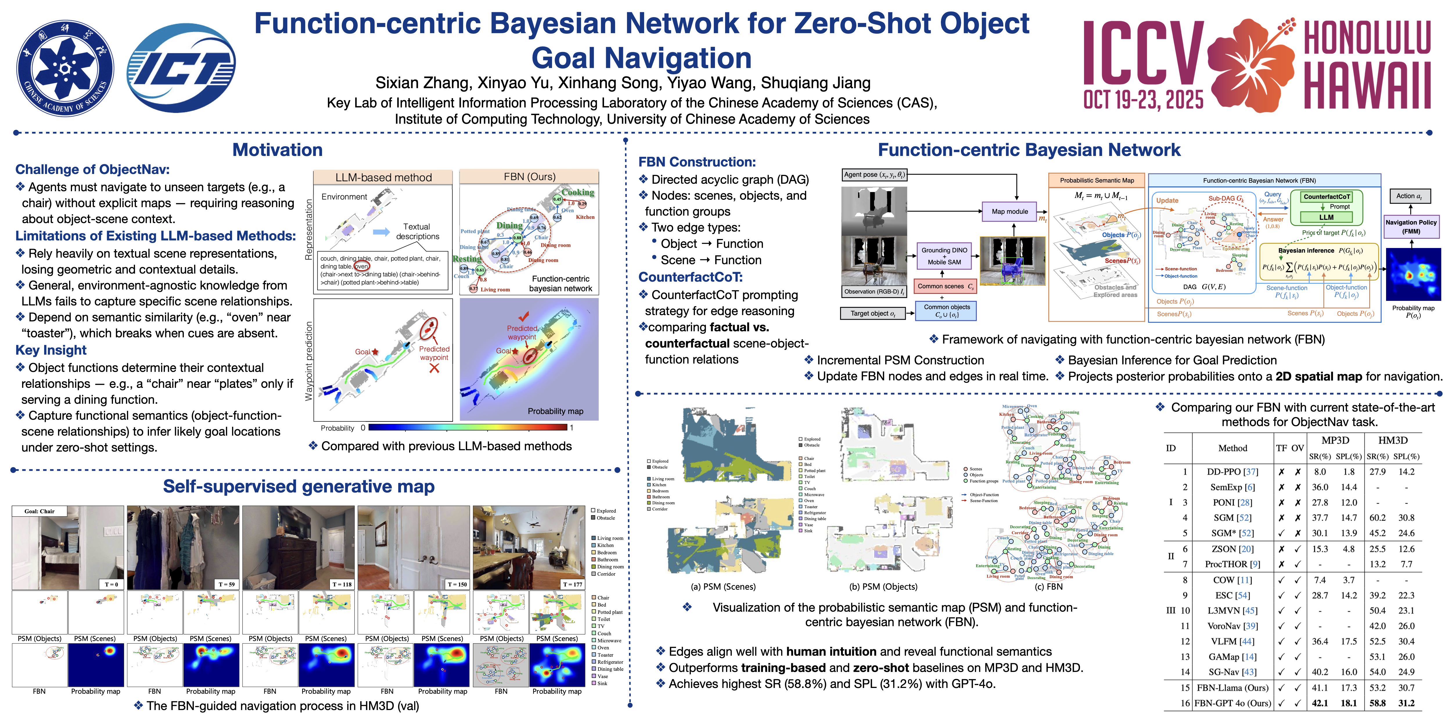 Object goal navigation requires an agent to navigate to a specified target in unseen environments without an explicit map, which demands an understanding of object-scene contextual relationships to infer the target's location based on partial observations.The function of an object plays a crucial role in its categorization and naming. Analyzing an object's functional role within a given scene enhances the understanding of its contextual relationships, thereby aiding in goal inference. In this paper, we propose the function-centric bayesian Network (FBN) for the zero-shot ObjectNav task.FBN is designed to uncover the functions that observed objects afford individually or collaboratively with other objects, as well as the functional semantics contained within the observed scenes. The probabilistic directed edges in FBN describe the object-function and scene-function relationships, which are derived by prompting LLMs with the proposed CounterfactCoT. CounterfactCoT determines existence and probability of edgs, by guiding LLMs to compare the impact of an edge’s existence or absence on the surrounding context.Leveraging FBN with Bayesian inference, the probability of each function group and probability map of goal occurance are computed. Then the waypoint is selected based on obtained probability map. Experiments on MP3D and HM3D demonstrate that FBN effectively captures object-scene-function relationships and improves zero-shot ObjectNav performance.