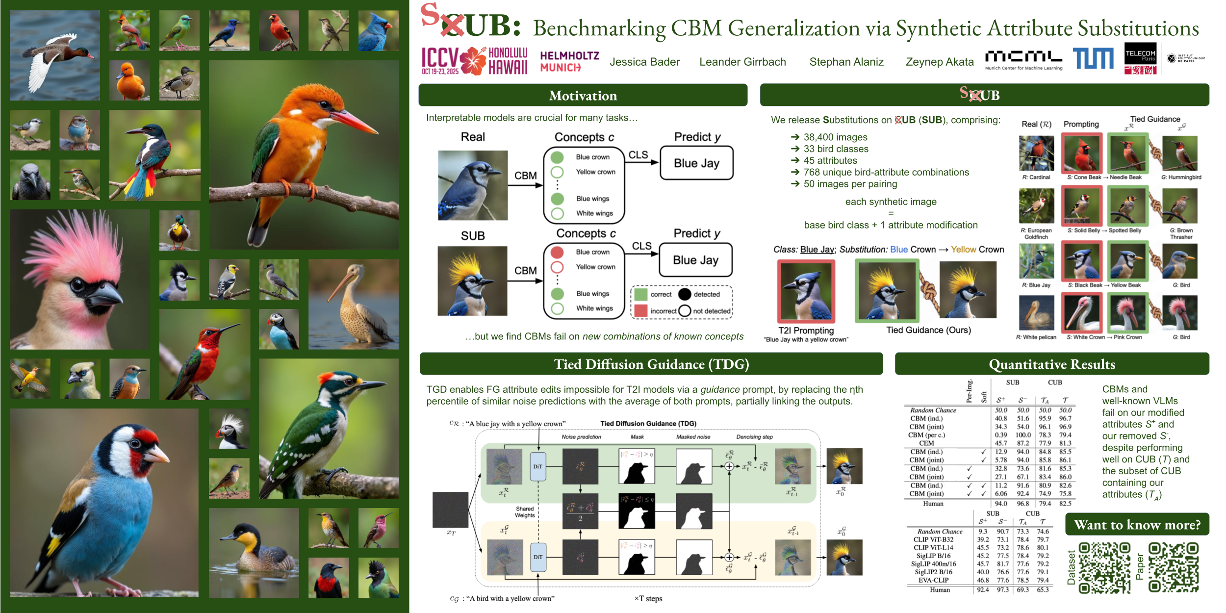 Concept Bottleneck Models (CBMs) and other interpretable models show great promise for making AI applications more transparent, which is essential in fields like medicine. Despite their success, we demonstrate that CBMs struggle to reliably identify the correct concept values under distribution shifts. To assess the robustness of CBMs to concept variations, we introduce SUB --- a fine-grained image and concept dataset containing 38,400 synthetic images based on the CUB bird dataset. To create SUB, we select a subset of 33 bird classes and 32 concepts from CUB to generate counterfactual bird images where a specific concept, such as wing color or belly pattern, is substituted.To achieve precise control for generated images, we introduce a novel Tied Diffusion Guidance (TDG) method, where noise sharing for two parallel denoising processes ensures that both the correct bird class and the correct bird concept are generated. This novel dataset enables rigorous evaluation of CBMs and similar interpretable models, contributing to the development of more robust methods.Furthermore, we show that the common practice of training CBMs using class-level concept annotations does not lead to generalized recognition of the concepts. Our code and data will be released upon acceptance.