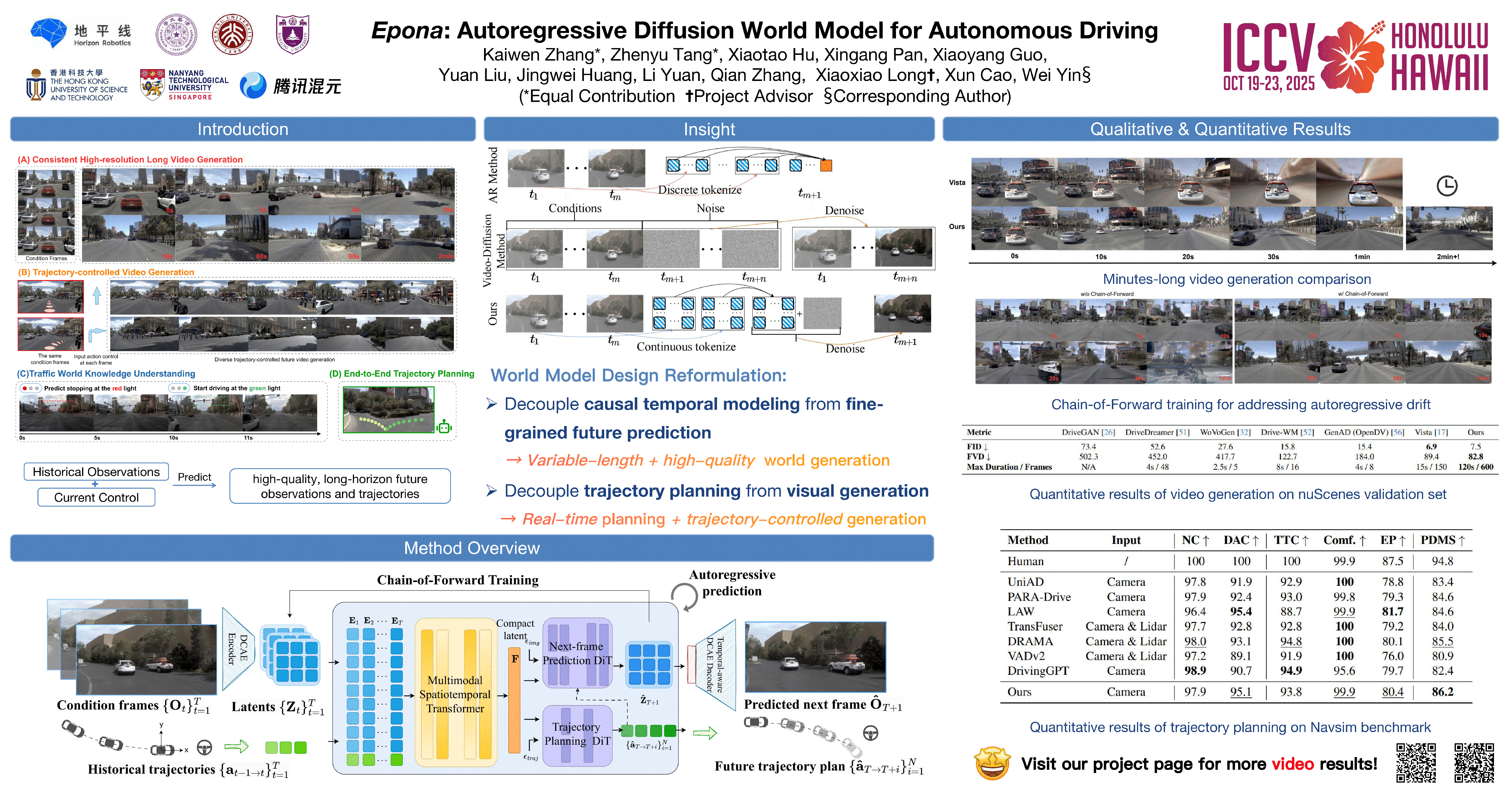Diffusion models have demonstrated exceptional visual quality in video generation, making them promising for autonomous driving world modeling. However, existing video diffusion-based world models struggle with flexible-length, long-horizon predictions and integrating trajectory planning. This is because conventional video diffusion models rely on global joint distribution modeling of fixed-length frame sequences rather than sequentially constructing localized distributions at each timestep. In this work, we propose Epona, an autoregressive diffusion world model that enables localized spatiotemporal distribution modeling through two key innovations: 1) Decoupled spatiotemporal factorization that separates temporal dynamics modeling from fine-grained future world generation, and 2) Modular trajectory and video prediction that seamlessly integrate motion planning with visual modeling in an end-to-end framework. Our architecture enables high-resolution, long-duration generation while introducing a novel chain-of-forward training strategy to address error accumulation in autoregressive loops. Experimental results demonstrate state-of-the-art performance with 7.4\% FVD improvement and minutes longer prediction duration compared to prior works. The learned world model further serves as a real-time motion planner, outperforming strong end-to-end planners on NAVSIM benchmarks.