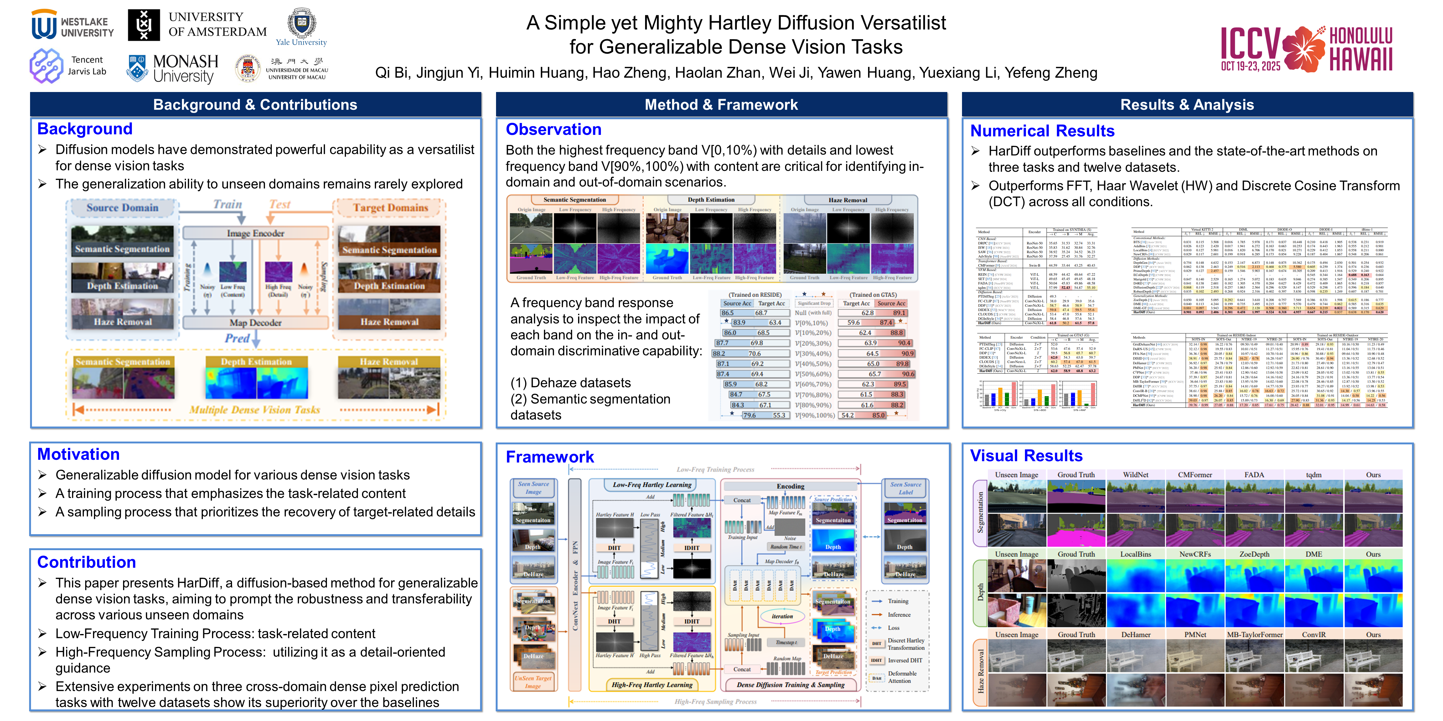 Diffusion models have demonstrated powerful capability as a versatilist for dense vision tasks, yet the generalization ability to unseen domains remains rarely explored.In light of this issue, we focus on investigating generalizable paradigms for diffusion based dense prediction and propose an efficient frequency learning scheme, dubbed as \texttt{HarDiff}, alleviating the domain gap across various scenes.Interestingly, the low-frequency features, converted by the Discrete Hartley Transform, activate the broader content of an image, while the high-frequency features maintain sufficient details for dense pixels.Hence, our \texttt{HarDiff} is driven by two compelling designs:(1) Low-Frequency Training Process, which extracts structural priors from the source domain, for enhancing understanding of task-related content;(2) High-Frequency Sampling Process, which utilizes detail-oriented guidance from the unseen target domain, to infer precise dense predictions with target-related details.Extensive empirical evidence shows that \texttt{HarDiff} can be easily plugged into various dense vision tasks, \eg. semantic segmentation, depth estimation and haze removal, yielding improvements over the state-of-the-art methods in twelve public benchmarks. We will release our code.