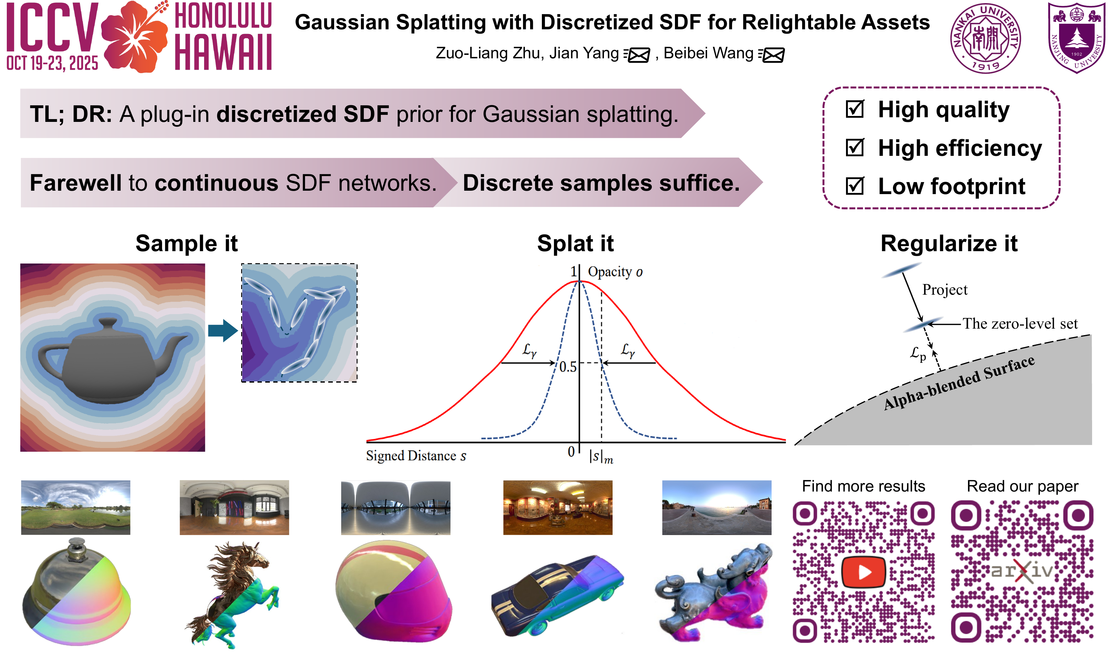 Gaussian Splatting with Discretized SDF for Relightable Assets