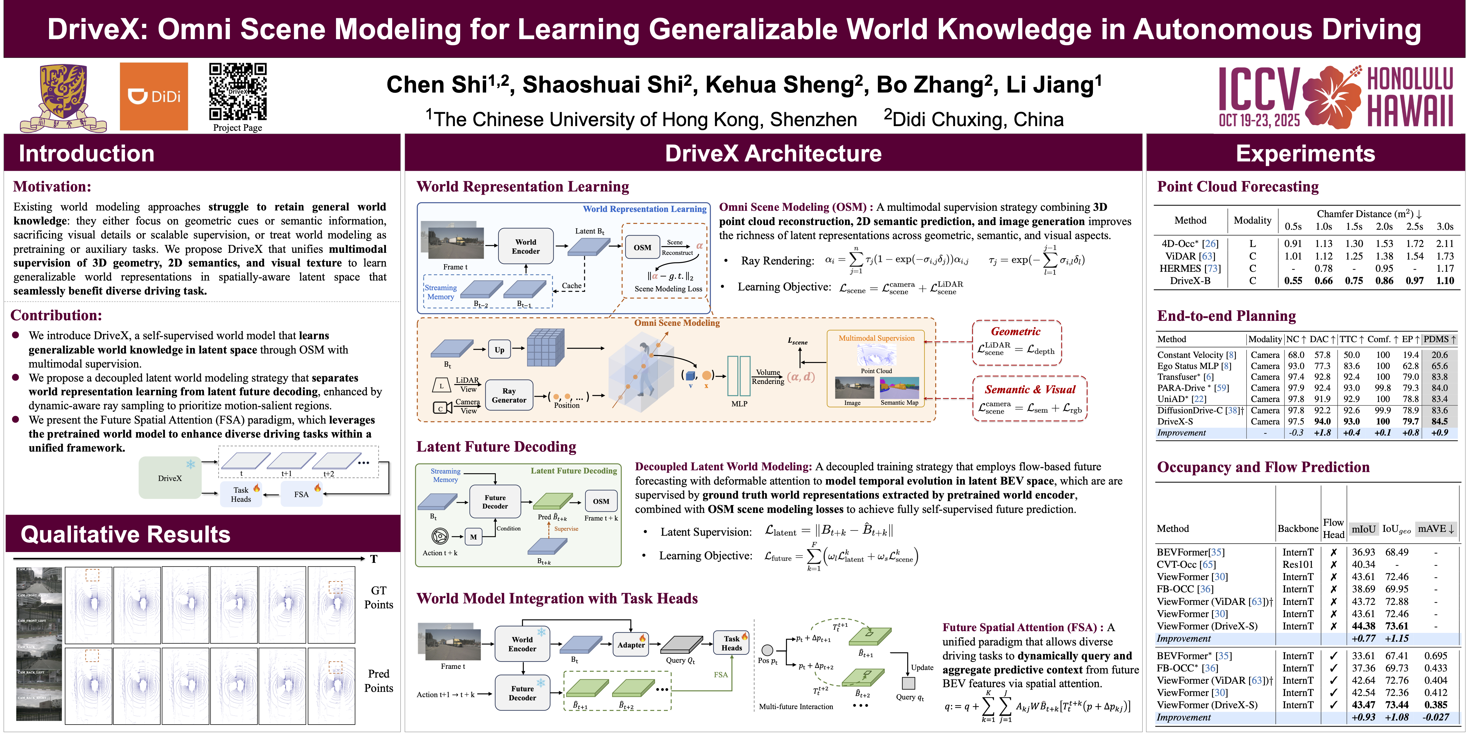 Data-driven learning has advanced autonomous driving, yet task-specific models struggle with out-of-distribution scenarios due to their narrow optimization objectives and reliance on costly annotated data. We present DriveX, a self-supervised world model that learns generalizable scene dynamics and holistic representations (geometric, semantic, and motion) from large-scale driving videos. DriveX introduces Panoptic Scene Modeling (PSM), a module that unifies multimodal supervision—3D point cloud forecasting, 2D semantic representation, and image generation—to capture comprehensive scene evolution. To simplify learning complex dynamics, we propose a decoupled latent world modeling strategy that separates world representation learning from future state decoding, augmented by dynamic-aware ray sampling to enhance motion modeling. For downstream adaptation, we design Future Spatial Attention (FSA), a unified paradigm that dynamically aggregates spatiotemporal features from DriveX’s predictions to enhance task-specific inference. Extensive experiments demonstrate DriveX’s effectiveness: it achieves significant improvements in 3D future point cloud prediction over prior work, while attaining state-of-the-art results on diverse tasks including occupancy prediction, flow estimation, and end-to-end driving. These results validate DriveX’s capability as a general-purpose world model, paving the way for robust and unified autonomous driving frameworks.