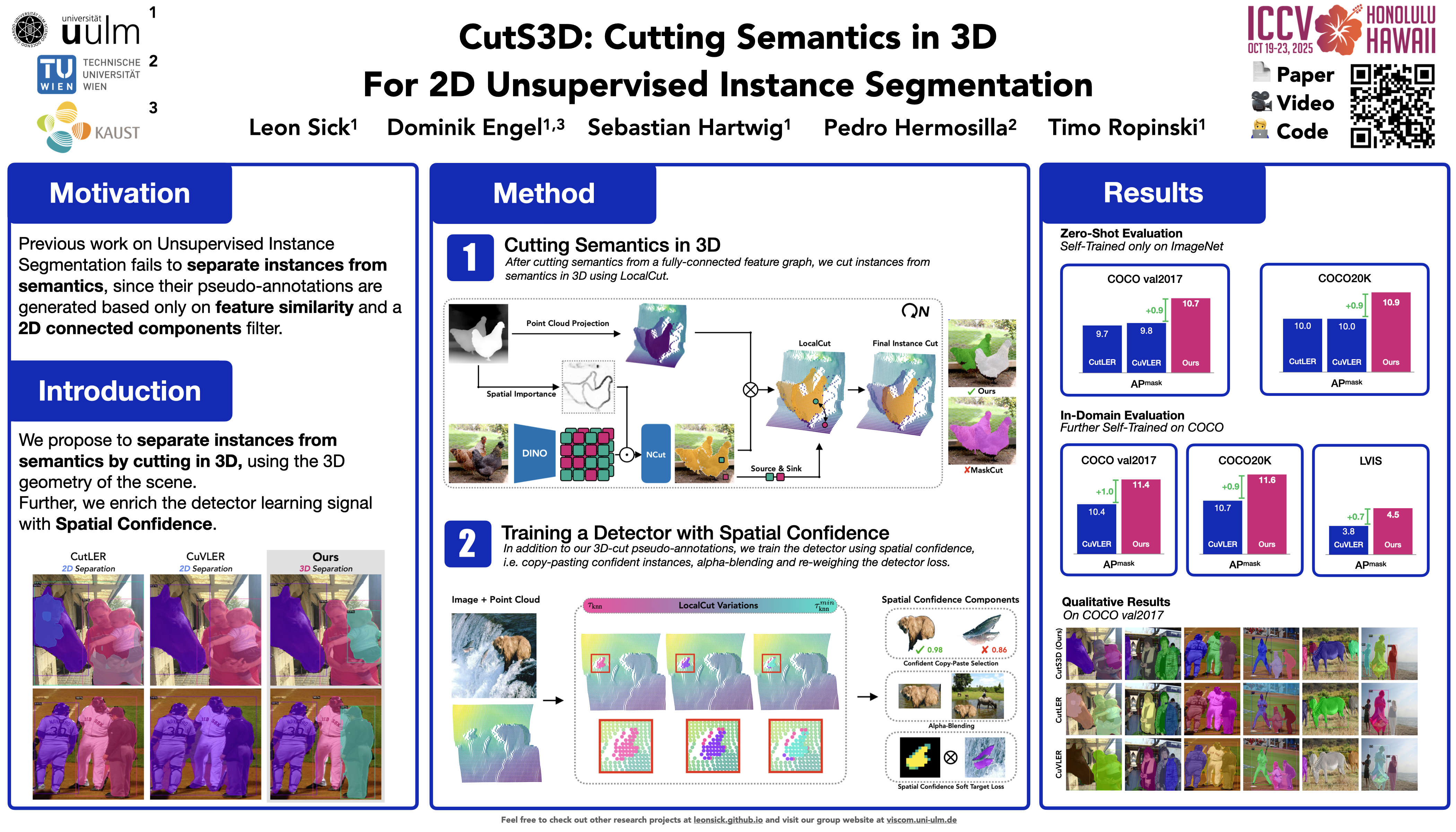 Traditionally, algorithms that learn to segment object instances in 2D images have heavily relied on large amounts of human-annotated data. Only recently, novel approaches have emerged tackling this problem in an unsupervised fashion. Generally, these approaches first generate pseudo-masks and then train a class-agnostic detector. While such methods deliver the current state of the art, they often fail to correctly separate instances overlapping in 2D image space since only semantics are considered. To tackle this issue, we instead propose to cut the semantic masks in 3D to obtain the final 2D instances by utilizing a point cloud representation of the scene. Furthermore, we derive a Spatial Importance function, which we use to resharpen the semantics along the 3D borders of instances. Nevertheless, these pseudo-masks are still subject to mask ambiguity. To address this issue, we further propose to augment the training of a class-agnostic detector with three Spatial Confidence components aiming to isolate a clean learning signal. With these contributions, our approach outperforms competing methods across multiple standard benchmarks for unsupervised instance segmentation and object detection.