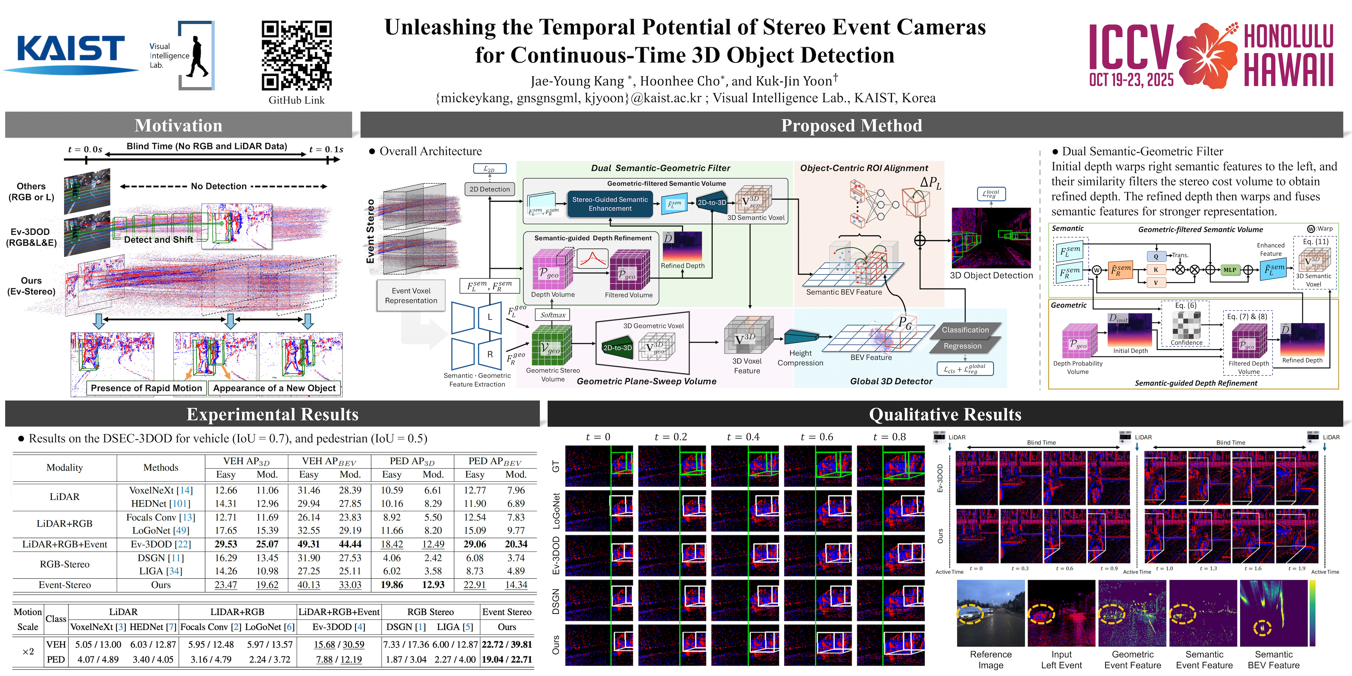 3D object detection is essential for autonomous systems, enabling precise localization and dimension estimation. While LiDAR and RGB cameras are widely used, their fixed frame rates create perception gaps in high-speed scenarios. Event cameras, with their asynchronous nature and high temporal resolution, offer a solution by capturing motion continuously. The recent approach, which integrates event cameras with conventional sensors for continuous-time detection, struggles in fast-motion scenarios due to its dependency on synchronized sensors. We propose a novel 3D object detection framework that relies solely on event cameras, eliminating the need for conventional 3D sensors. To compensate for the lack of semantic and geometric information in event data, we introduce a dual filter mechanism that extracts both. Additionally, we enhance regression by aligning bounding boxes with object-centric information. Experiments show that our method outperforms prior approaches in dynamic environments, demonstrating the potential of event cameras for robust, continuous-time 3D perception. Our project code will be publicly available.