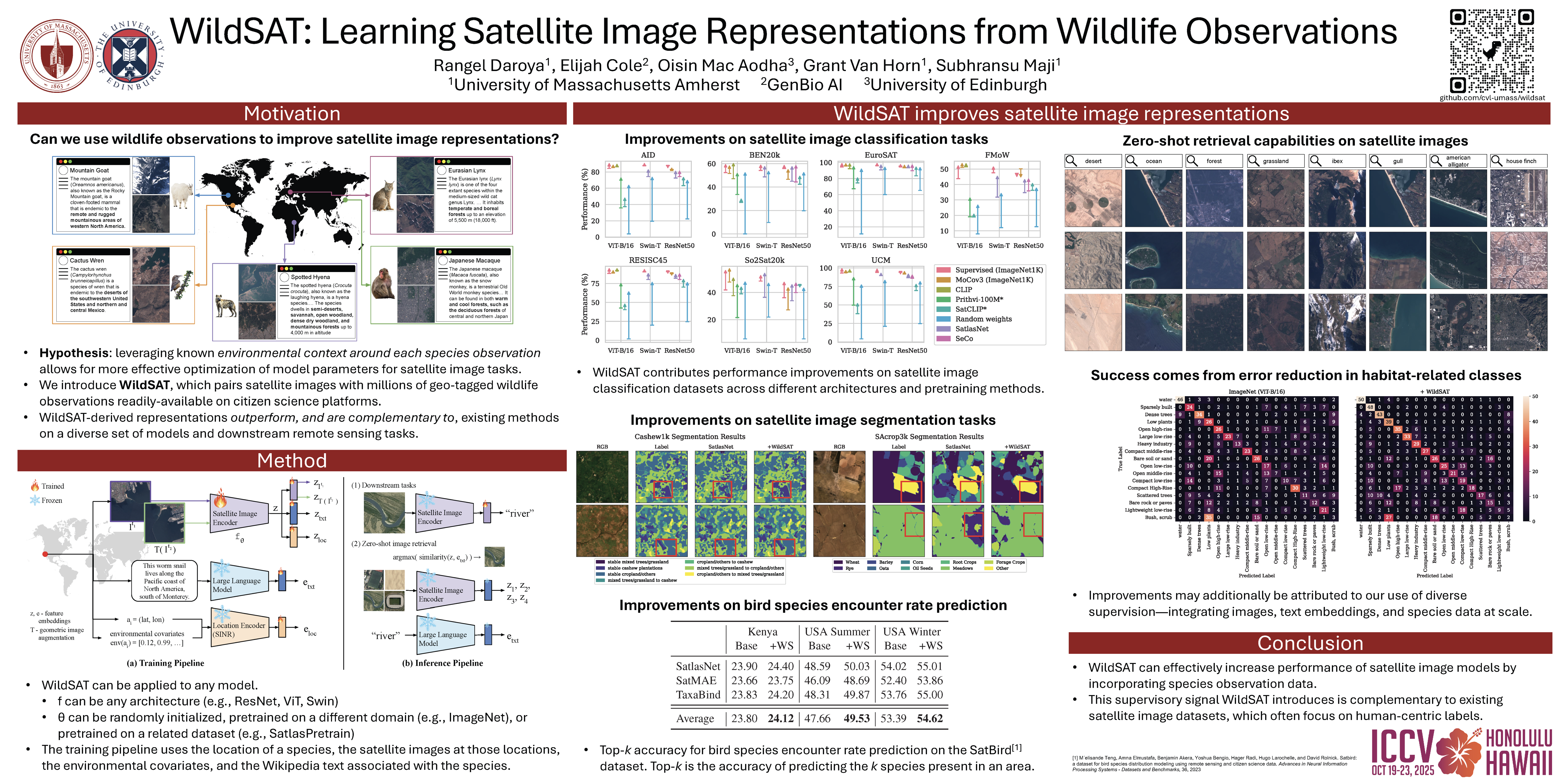 Species distributions encode valuable ecological and environmental information, yet their potential for guiding representation learning in remote sensing remains underexplored. We introduce WildSAT, which pairs satellite images with millions of geo-tagged wildlife observations readily-available on citizen science platforms. WildSAT employs a contrastive learning approach that jointly leverages satellite images, species occurrence maps, and textual habitat descriptions to train or fine-tune models. This approach significantly improves performance on diverse satellite image recognition tasks, outperforming both ImageNet-pretrained models and satellite-specific baselines. Additionally, by aligning visual and textual information, WildSAT enables zero-shot retrieval, allowing users to search geographic locations based on textual descriptions. WildSAT surpasses recent cross-modal learning methods, including approaches that align satellite images with ground imagery or wildlife photos, demonstrating the advantages of our approach. Finally, we analyze the impact of key design choices and highlight the broad applicability of WildSAT to remote sensing and biodiversity monitoring.
