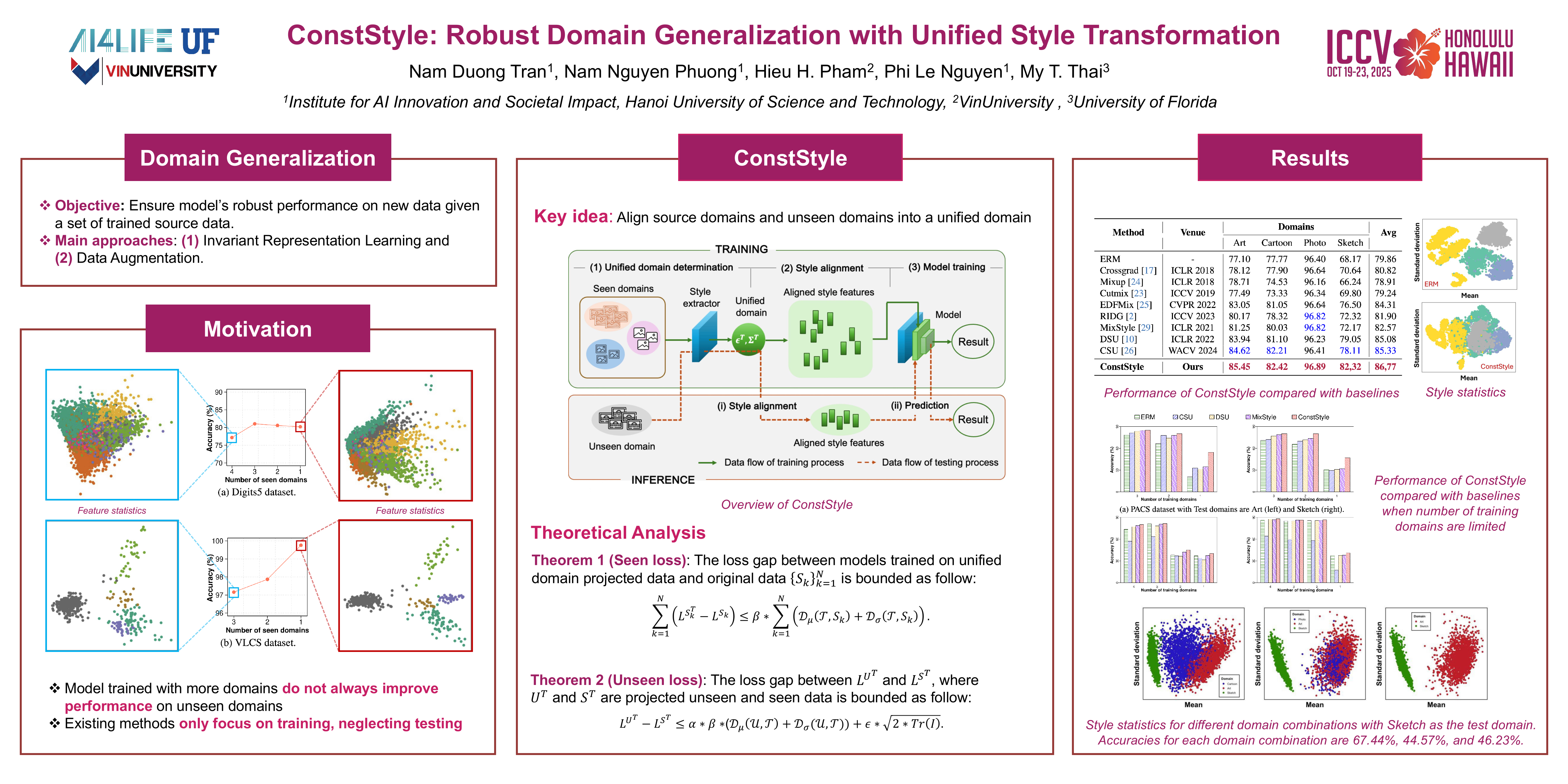 Deep neural networks often suffer performance drops when test data distribution differs from training data. Domain Generalization (DG) aims to address this by focusing on domain-invariant features or augmenting data for greater diversity. However, these methods often struggle with limited training domains or significant gaps between seen (training) and unseen (test) domains. To enhance DG robustness, we hypothesize that it is essential for the model to be trained on data from domains that closely resemble unseen test domains—an inherently difficult task due to the absence of prior knowledge about the unseen domains. Accordingly, we propose ConstStyle, a novel approach that leverages a unified domain to capture domain-invariant features and bridge the domain gap with theoretical analysis. During training, all samples are mapped onto this unified domain, optimized for seen domains. During testing, unseen domain samples are projected similarly before predictions. By aligning both training and testing data within this unified domain, ConstStyle effectively reduces the impact of domain shifts, even with large domain gaps or few seen domains. Extensive experiments demonstrate that ConstStyle consistently outperforms existing methods across diverse scenarios. Notably, when only a limited number of seen domains are available, ConstStyle can boost accuracy up to 19.82\% compared to the next best approach.