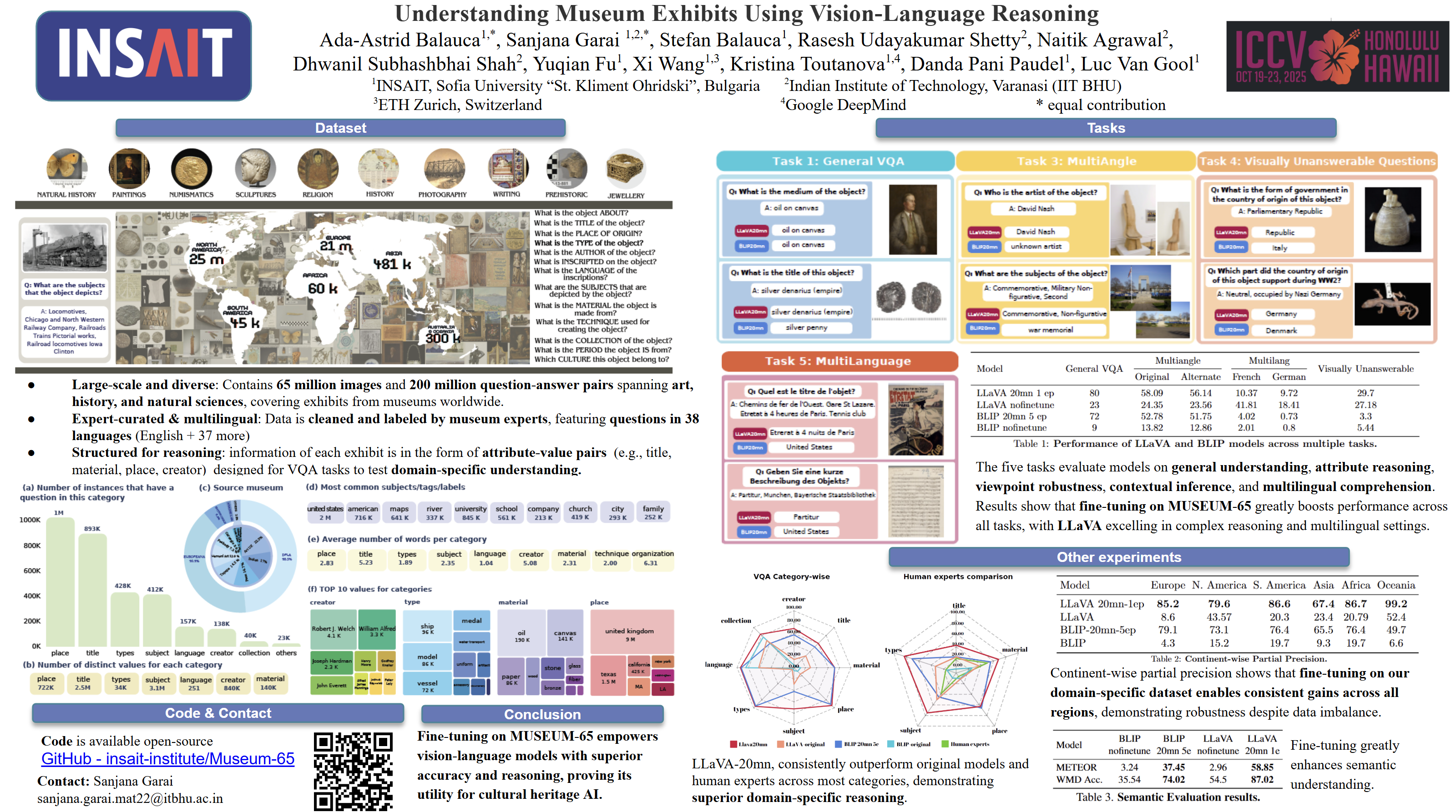 Museums serve as repositories of cultural heritage and historical artifacts from diverse epochs, civilizations, and regions, preserving well-documented collections that encapsulate vast knowledge, which, when systematically structured into large-scale datasets, can train specialized models. Visitors engage with exhibits through curiosity and questions, making expert domain-specific models essential for interactive query resolution and gaining historical insights. Understanding exhibits from images requires analyzing visual features and linking them to historical knowledge to derive meaningful correlations. We facilitate such reasoning by (a) collecting and curating a large-scale dataset of 65M images and 200M question-answer pairs for exhibits from all around the world; (b) training large vision-language models (VLMs) on the collected dataset; (c) benchmarking their ability on five visual question answering tasks, specifically designed to reflect real-world inquiries and challenges observed in museum settings.The complete dataset is labeled by museum experts, ensuring the quality and the practical significance of the labels. We train two VLMs from different categories: BLIP with vision-language aligned embeddings, but lacking the expressive power of large language models, and the LLaVA model, a powerful instruction-tuned LLM enriched with vision-language reasoning capabilities. Through extensive experiments, we find that while both model types effectively answer visually grounded questions, large vision-language models excel in queries requiring deeper historical context and reasoning. We further demonstrate the necessity of fine-tuning models on large-scale domain-specific datasets by showing that our fine-tuned models significantly outperform current SOTA VLMs in answering questions related to specific attributes, highlighting their limitations in handling complex, nuanced queries. Our dataset, benchmarks, and source code will be made publicly available.