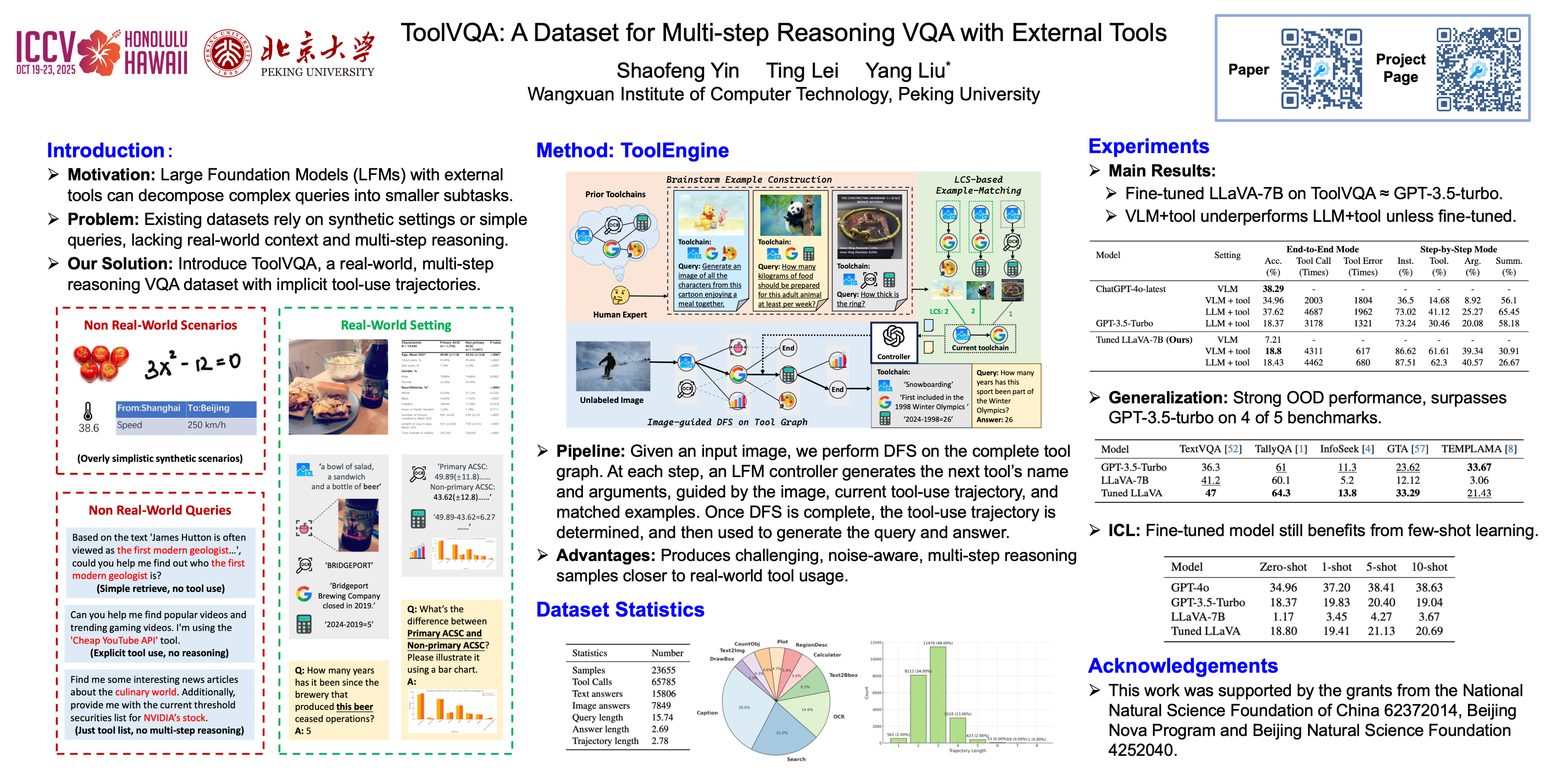 Integrating external tools into Large Foundation Models (LFMs) has emerged as a promising approach to enhance their problem-solving capabilities. While existing studies have demonstrated strong performance in tool-augmented Visual Question Answering (VQA), recent benchmarks reveal significant gaps in real-world tool-use proficiency, particularly in functionally diverse multimodal settings requiring multi-step reasoning. In this work, we introduce ToolVQA, a large-scale multimodal dataset comprising 23K instances, designed to bridge this gap. Unlike previous datasets that rely on synthetic scenarios and simplified queries, ToolVQA features real-world visual contexts and challenging implicit multi-step reasoning tasks, better aligning with real user interactions. To construct this dataset, we propose ToolEngine, a novel data generation pipeline that employs Depth-First Search (DFS) with a dynamic in-context example matching mechanism to simulate human-like tool-use reasoning. ToolVQA encompasses 10 multimodal tools across 7 diverse task domains, with an average inference length of 2.78 reasoning steps per instance. The fine-tuned 7B LFMs on ToolVQA not only achieve impressive performance on our test set but also surpass the large close-sourced model GPT-3.5-turbo on various out-of-distribution (OOD) datasets, demonstrating strong generalizability to real-world tool-use scenarios.