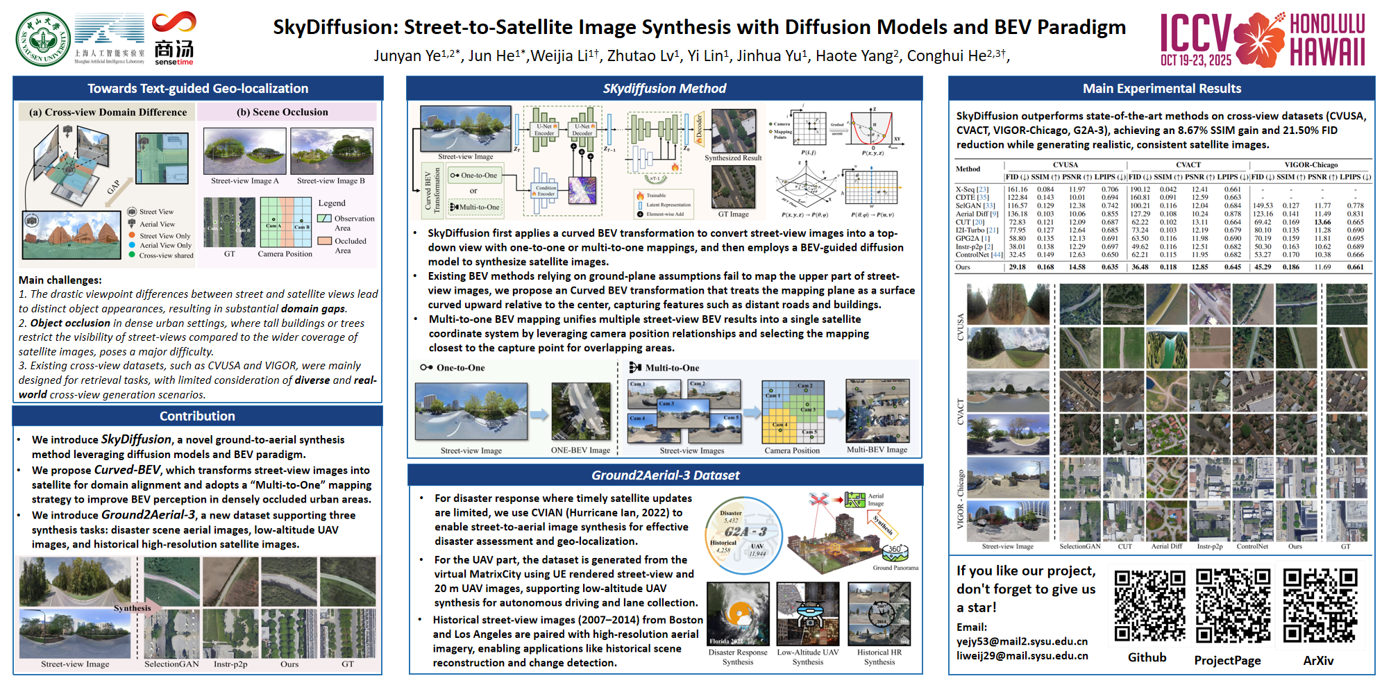 Ground-to-aerial image synthesis focuses on generating realistic aerial images from corresponding ground street view images while maintaining consistent content layout, simulating a top-down view. The significant viewpoint difference leads to domain gaps between views, and dense urban scenes limit the visible range of street views, making this cross-view generation task particularly challenging. In this paper, we introduce SkyDiffusion, a novel cross-view generation method for synthesizing aerial images from street view images, utilizing a diffusion model and the Bird’s-Eye View (BEV) paradigm. The Curved-BEV method in SkyDiffusion converts street-view images into a BEV perspective, effectively bridging the domain gap, and employs a "multi-to-one" mapping strategy to address occlusion issues in dense urban scenes. Next, SkyDiffusion designed a BEV-guided diffusion model to generate content-consistent and realistic aerial images. Additionally, we introduce a novel dataset, Ground2Aerial-3, designed for diverse ground-to-aerial image synthesis applications, including disaster scene aerial synthesis, low-altitude UAV image synthesis, and historical high-resolution satellite image synthesis tasks. Experimental results demonstrate that SkyDiffusion outperforms state-of-the-art methods on cross-view datasets across natural (CVUSA), suburban (CVACT), urban (VIGOR-Chicago), and various application scenarios (G2A-3), achieving realistic and content-consistent aerial image generation. The code, datasets and more information of this work can be found at https://skydiffusion0307.github.io/.