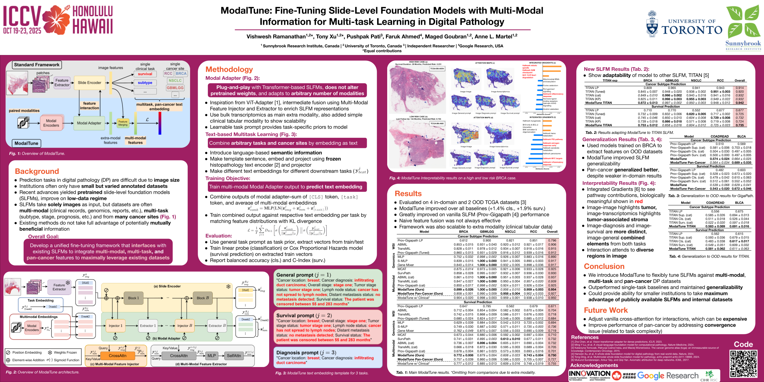 Prediction tasks in digital pathology are challenging due to the massive size of whole-slide images (WSIs) and the weak nature of training signals. Advances in computing, data availability, and self-supervised learning (SSL) have paved the way for slide-level foundation models (SLFMs) that can improve prediction tasks in low-data regimes. However, working with these models is challenging, with issues such as catastrophic forgetting during fine-tuning and under-utilization of shared information between tasks and modalities. To overcome these two challenges, we propose ModalTune, a novel fine-tuning framework which introduces the Modal Adapter to integrate new modalities without modifying SLFM weights. Additionally, we use large-language models (LLMs) to encode labels as text, capturing semantic relationships and enhancing generalization across multiple tasks and cancer types in a single training recipe. ModalTune achieves state-of-the-art (SOTA) results against both uni-modal and multi-modal models across four cancer types, jointly improving survival and cancer subtype prediction while remaining competitive in pan-cancer settings. Additionally, we show ModalTune is highly generalizable to two out-of-distribution (OOD) datasets. To our knowledge, this is the first unified fine-tuning framework for multi-modal, multi-task, and pan-cancer modeling in digital pathology. Code will be shared after blind-review.