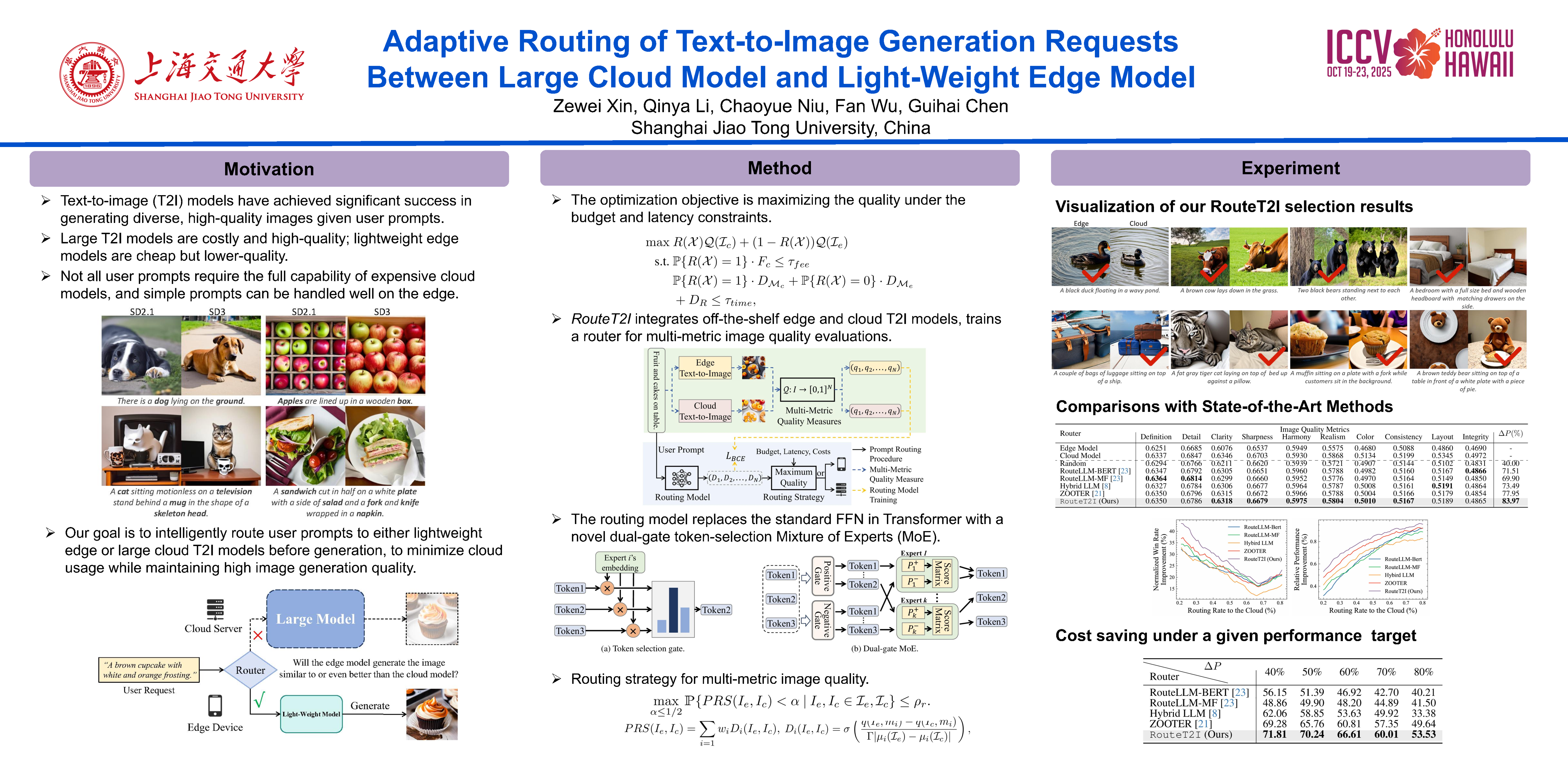Large text-to-image models demonstrate impressive generation capabilities; however, their substantial size necessitates expensive cloud servers for deployment. Conversely, light-weight models can be deployed on edge devices at lower cost but often with inferior generation quality for complex user prompts. To strike a balance between performance and cost, we propose a routing framework, called RouteT2I, which dynamically selects either the large cloud model or the light-weight edge model for each user prompt. Since generated image quality is challenging to measure and compare directly, RouteT2I establishes multi-dimensional quality metrics, particularly, by evaluating the similarity between the generated images and both positive and negative texts that describe each specific quality metric. RouteT2I then predicts the expected quality of the generated images by identifying key tokens in the prompt and comparing their impact on the quality. RouteT2I further introduces the Pareto relative superiority to compare the multi-metric quality of the generated images. Based on this comparison and predefined cost constraints, RouteT2I allocates prompts to either the edge or the cloud. Evaluation reveals that RouteT2I significantly reduces the number of requesting large cloud model while maintaining high-quality image generation.