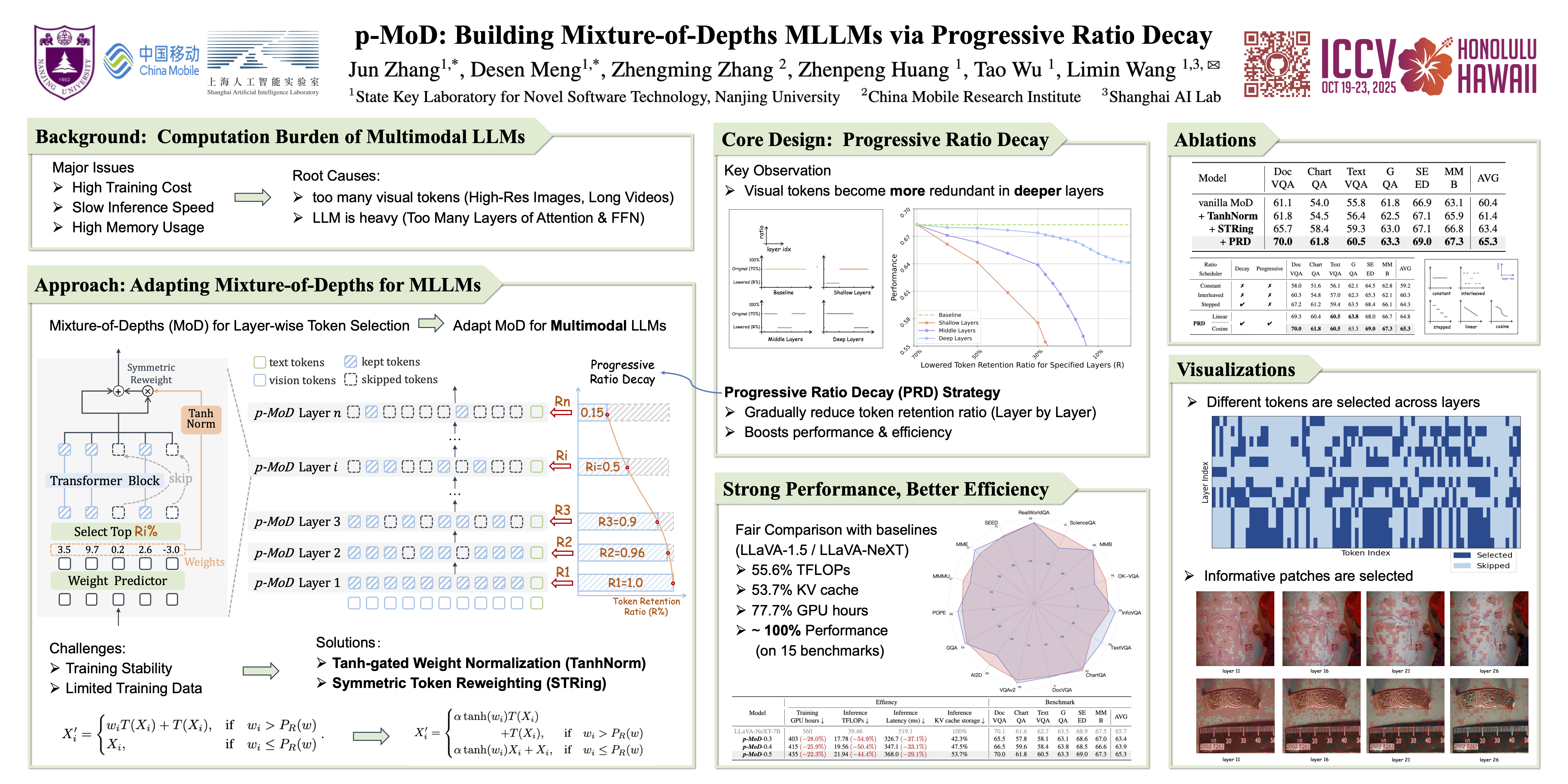 Despite the remarkable performance of multimodal large language models (MLLMs) across diverse tasks, the substantial training and inference costs impede their advancement. In this paper, we propose p-MoD, an efficient MLLM architecture that significantly reduces training and inference costs while maintaining model performance. The majority of computation in MLLMs stems from the overwhelming volume of vision tokens processed by the transformer-based LLM. Accordingly, we leverage the Mixture-of-Depths (MoD) mechanism, where each LLM layer selects essential vision tokens to process while skipping redundant ones. However, integrating MoD into MLLMs is non-trivial. To address the challenges of training and inference stability as well as limited training data, we adapt the MoD module with two novel designs: tanh-gated weight normalization (TanhNorm) and symmetric token reweighting (STRing). Moreover, we observe that vision tokens exhibit higher redundancy in deeper layers and thus design a progressive ratio decay (PRD) strategy, which gradually reduces the token retention ratio layer by layer, employing a shifted cosine schedule. This crucial design fully unleashes the potential of MoD, significantly boosting the efficiency and performance of our models. Extensive experiments on two baseline models across 15 benchmarks show that our model matches or even surpasses the performance of corresponding baselines, while requiring only 55.6% TFLOPs and 53.7% KV cache storage during inference, and 77.7% GPU hours during training.