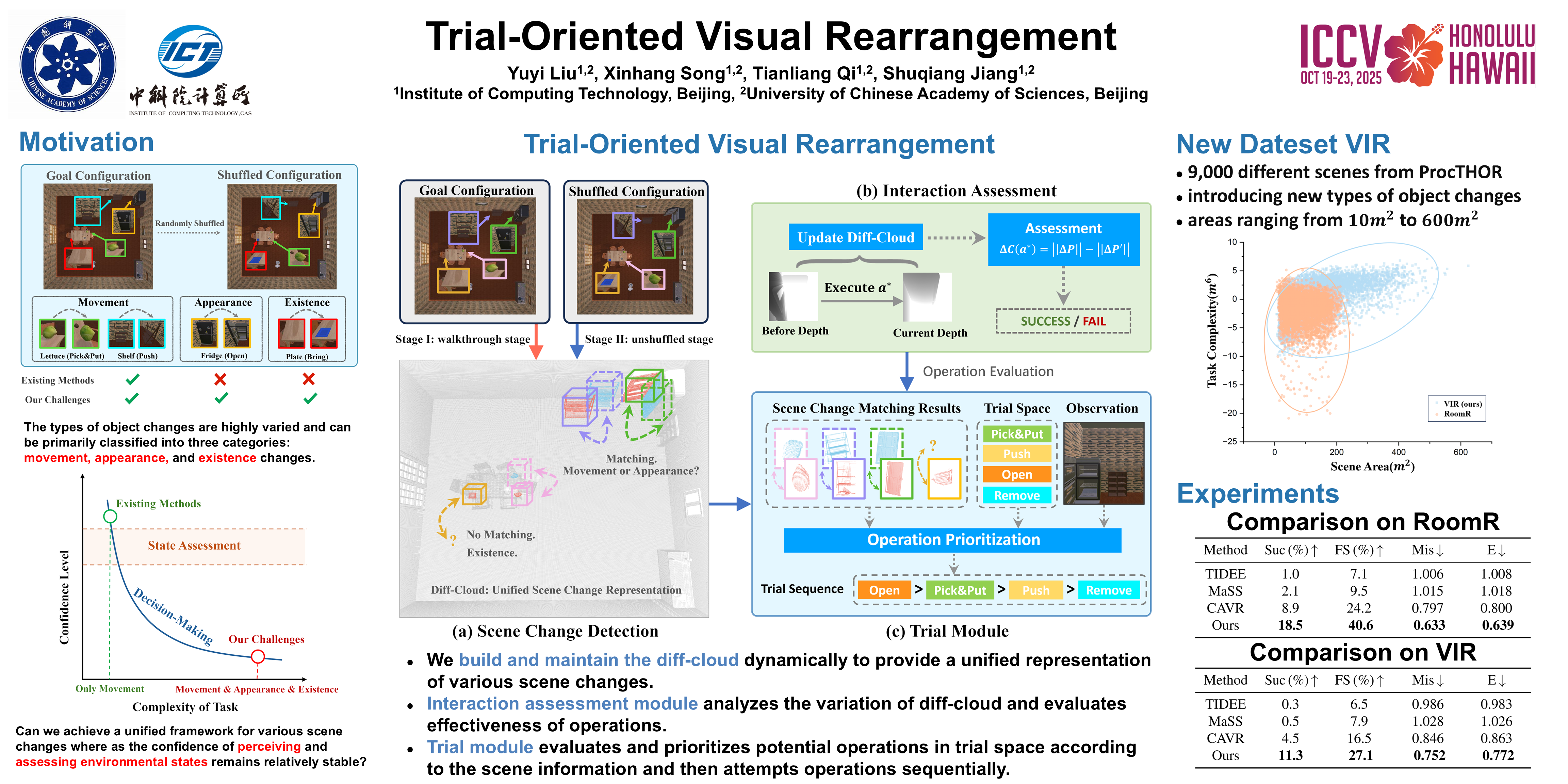 Towards visual room rearrangement for embodied agents, this paper tackles the intricate challenge of restoring a disarrayed scene configuration to its intended goal state. The task necessitates a range of sophisticated capabilities, including efficient spatial navigation, precise and accurate object interaction, sensitive scene change detection, and meticulous restoration techniques. The inherent complexity of this endeavor stems from the diverse nature of potential object changes, encompassing movements within the space, alterations in appearance, and changes in existence—where objects may be introduced or removed from the scene. Previous methods, either end-to-end reinforcement learning or modular approaches, struggle with handling these changes in a unified manner due to the heterogeneous nature of the inference spaces. To address this, this paper proposes a Trial-Oriented Visual Rearrangement (TOR) framework, which leverages the principles of stronger embodiment to prune the joint reasoning space and identify a smaller shared space for processing various object changes. TOR maintains a differential point cloud representation to capture environmental changes and uses two core mechanisms, assessment and refinement, to iteratively restore the scene to the goal state. Experimental results demonstrate the effectiveness of TOR in restoring both object movement and appearance changes and show its generalization to complex multi-room environments.