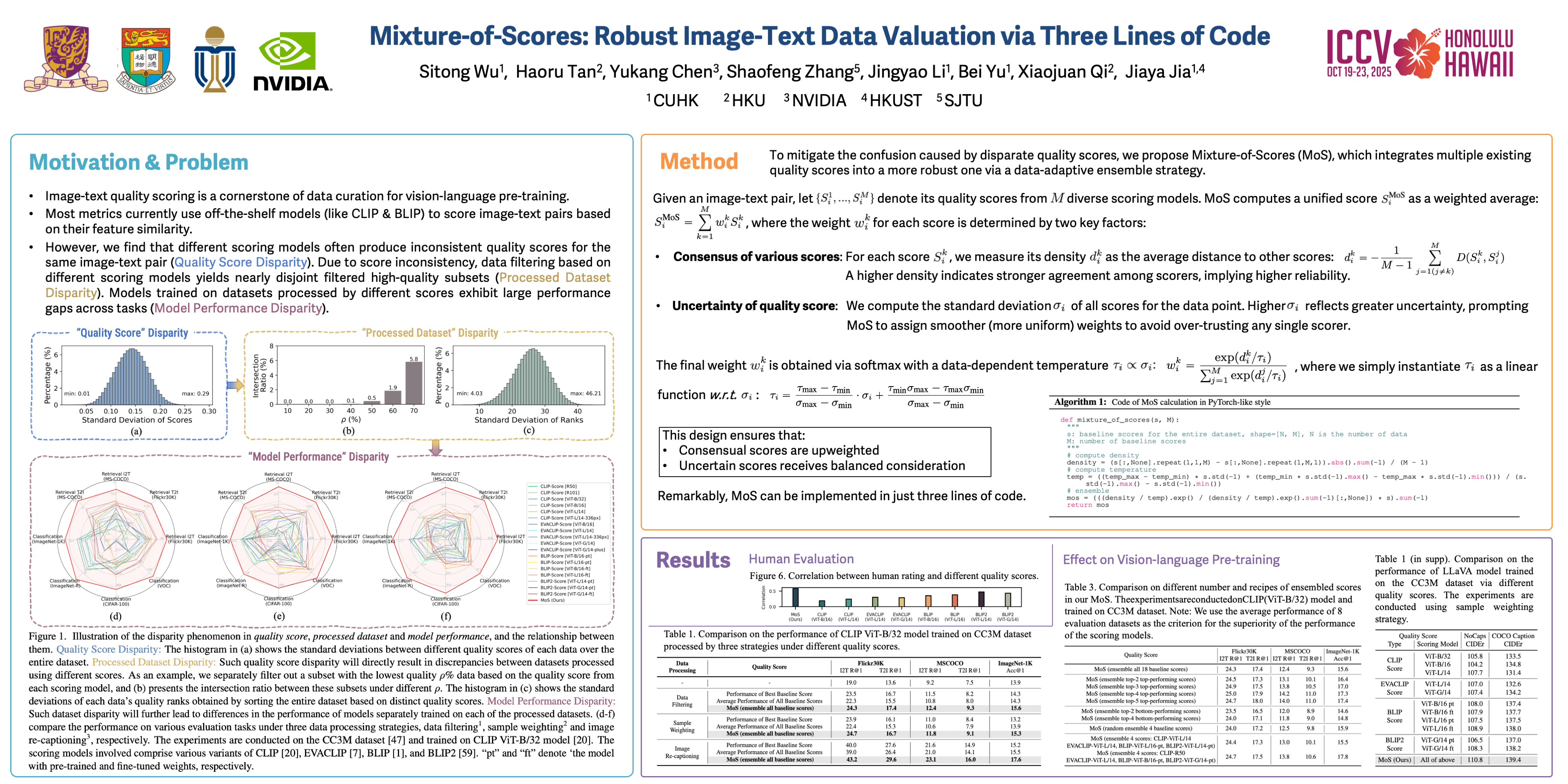Evaluating the quality of image-text pair data plays a crucial role in various data processing strategies for vision-language pre-training. Currently, most popular metrics rely on off-the-shelf vision-language models to generate quality scores for paired image and text based on their feature similarity, such as CLIP-Score. However, we observe a prevalent phenomenon, that is, different scoring models yield varying quality scores for the same data. This quality score disparity directly affects the result of data processing, leading to the discrepancy between datasets processed using different quality scores. Subsequently, this dataset disparity further results in the performance differences of models individually trained on the dataset processed by distinct quality scores. Notably, no single quality score performs optimally across all evaluation tasks. Each score exhibits an inherent bias towards certain concepts or tasks, and different scores have complementary effects on the model performance. This brings great confusion when choosing the scoring model. In this paper, we first investigate these disparity phenomena and analyze the reason. Then, we propose a simple yet effective method, named Mixture-of-Scores (MoS), to extract the essence of existing quality scores while eliminating their biases by integrating them into a more robust score based on a data-adaptive ensemble strategy. Particularly, it can be easily implemented with only three lines of code. Extensive experiments demonstrate the superiority and robustness of our MoS compared with any existing single quality score across a variety of vision-language tasks and benchmarks. We hope that our work can provide novel perspectives and practical tools, liberating the community from the quandary of choosing a scoring model.